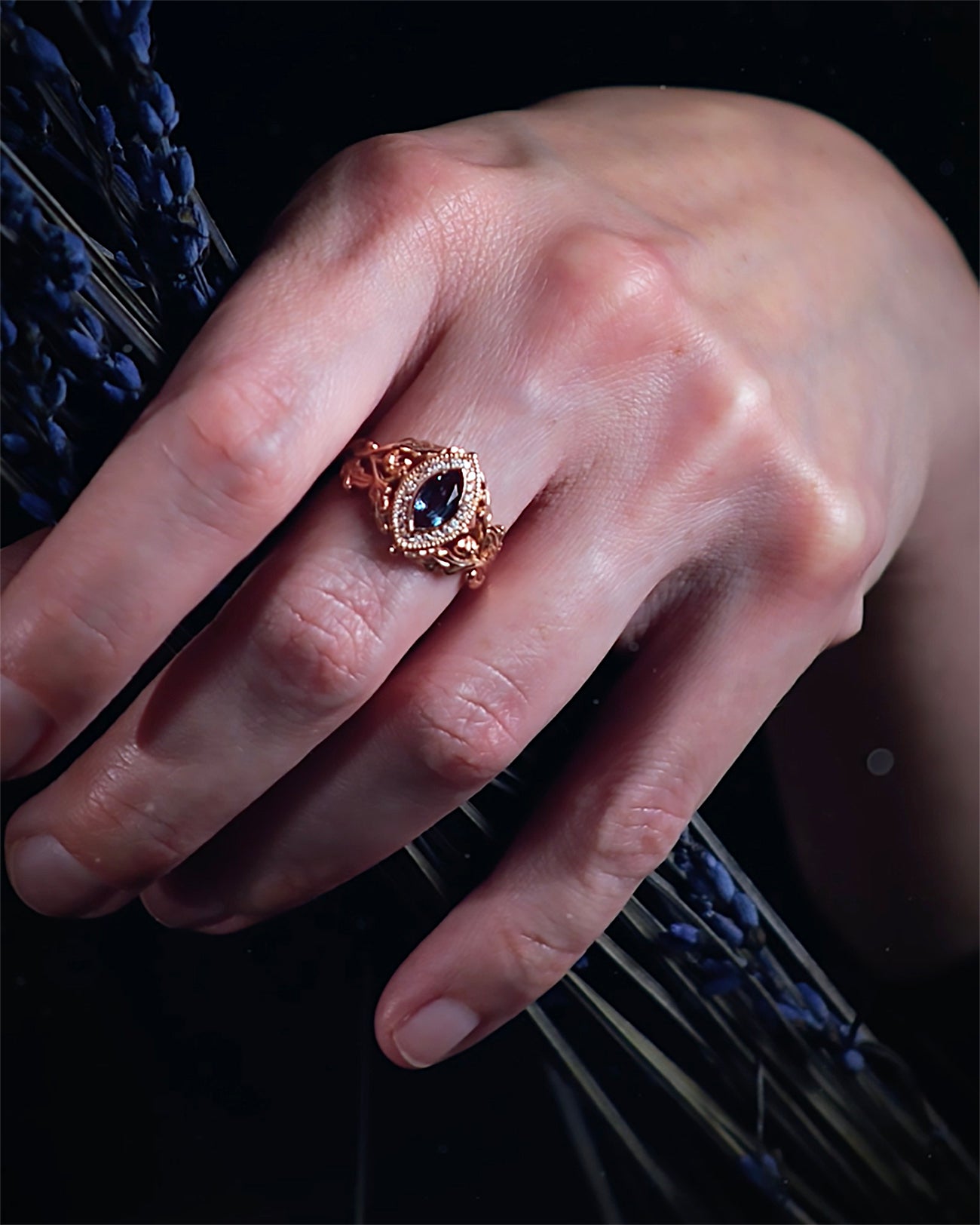 READY TO SHIP Dair ring in 14K rose gold, lab alexandrite marquise cut, natural diamonds, RING SIZES 5.5 - 8.5 US