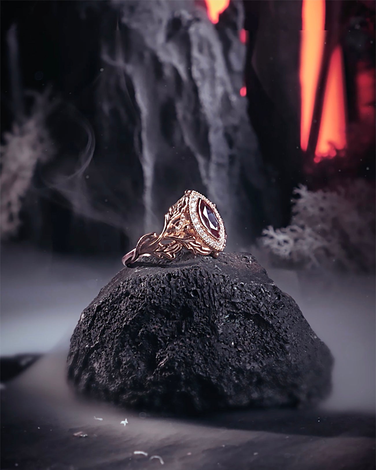 Highly detailed and with symbolic meaning behind: this is our Dair ring. Skilfully designed it features oak leaves holding magnificent halo with marquise central gemstone. As a final lovely touch you can see small gold acorns which symbolise potential and strength, honour and longevity.