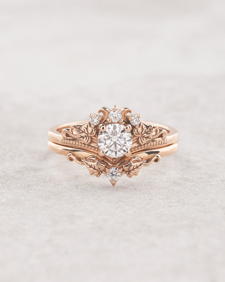 Magnificent wedding ring set features nature inspired style with tiny ivy leaves and the most delicate details you can imagine. Round cut lab grown diamond has great quality and sparkle. Small accent lab grown diamonds compliments this romantic jewelry piece.