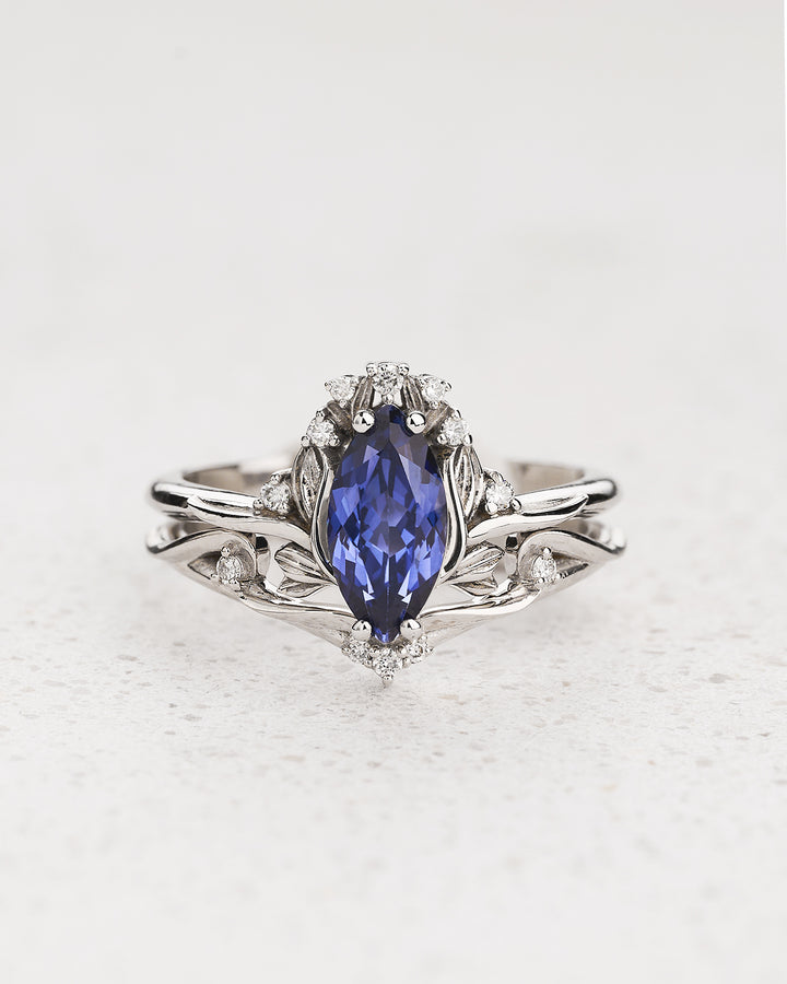 Make a statement of love and elegance with the enchanting Iris bridal set. This nature-inspired masterpiece is a unique ring set that captures the essence of beauty and romance. Reminiscent of a blooming Iris flower bud, this engagement ring features exceptional detailing and a foliage crown sculpted around a marquise-cut lab-grown sapphire.