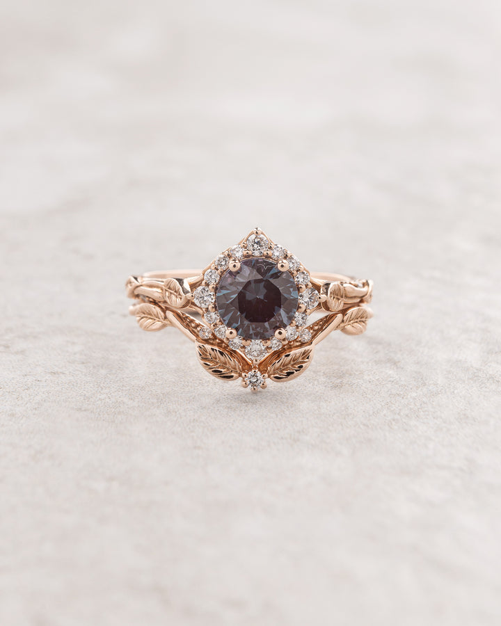 Lab alexandrite bridal ring set with diamond halo, romantic leaf ring