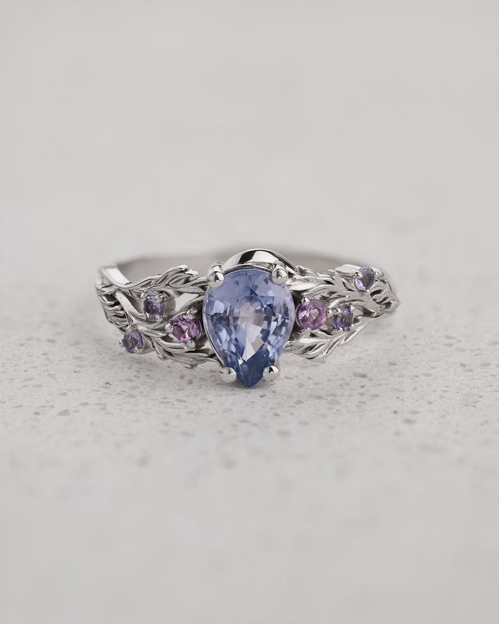 Delicately sculpted, this engagement ring would be perfect for alternative engagement ring seekers. You can see Japanese maple leaves wrapping the central gemstone - natural blue sapphire. Adorned with accent purple amethysts & blue tanzanites.
