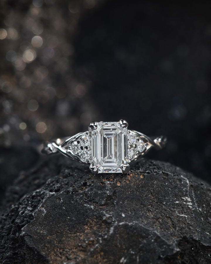 Gloria engagement ring features an elegant and classic emerald cut gemstone with a combination of dainty leaf band. Side diamonds creates a triangle on each side of the central gemstone and add an extra sparkle. A great choice for those looking for engagement ring with minimalistic look yet nature inspired style. It looks complimentary on any hand thanks to the vertical position of the central gemstone.