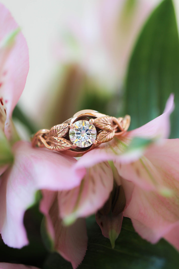 Lab grown diamond leaf engagement ring, rose gold nature inspired ring