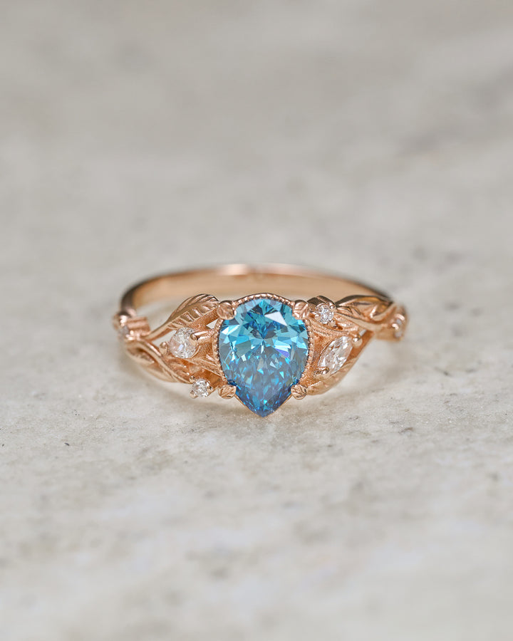 READY-TO-SHIP: Blue lab grown diamond engagement ring, accent diamonds, 14K rose gold, AVAILABLE SIZES: 5.5 - 8.5 US