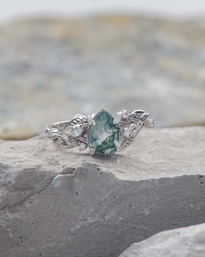 READY TO SHIP: Patricia ring in 14K white gold, natural moss agate pear cut 8x6 mm, accent lab grown diamonds, AVAILABLE RING SIZES: 4.5 - 9.5 US - Eden Garden Jewelry™