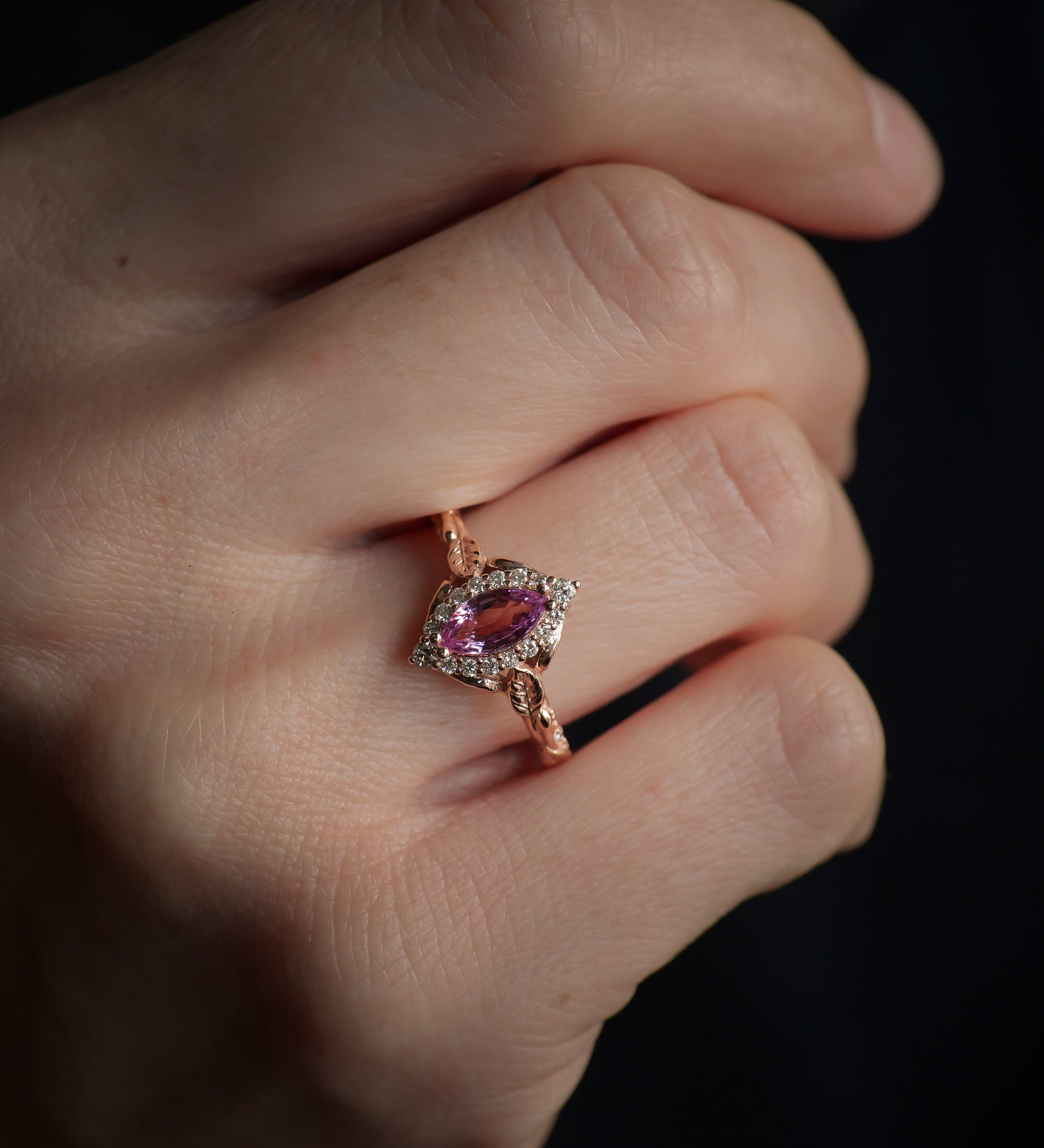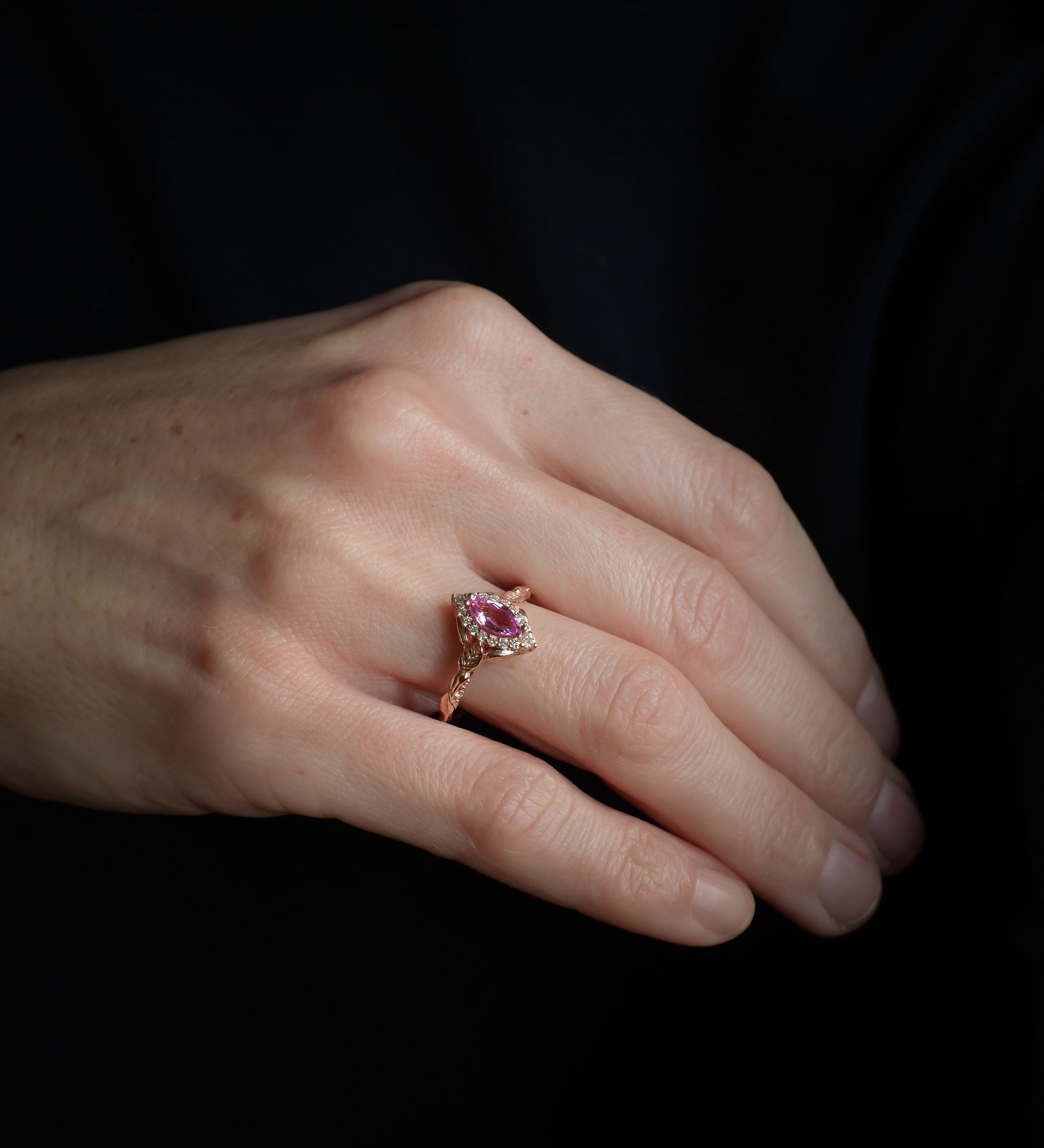 A rare species of flower grows in our garden, from the center of which we extract a mesmerizing pink stone. The exotic hue of the stone will spectacularly emphasize your uniqueness, unparalleled by anything.