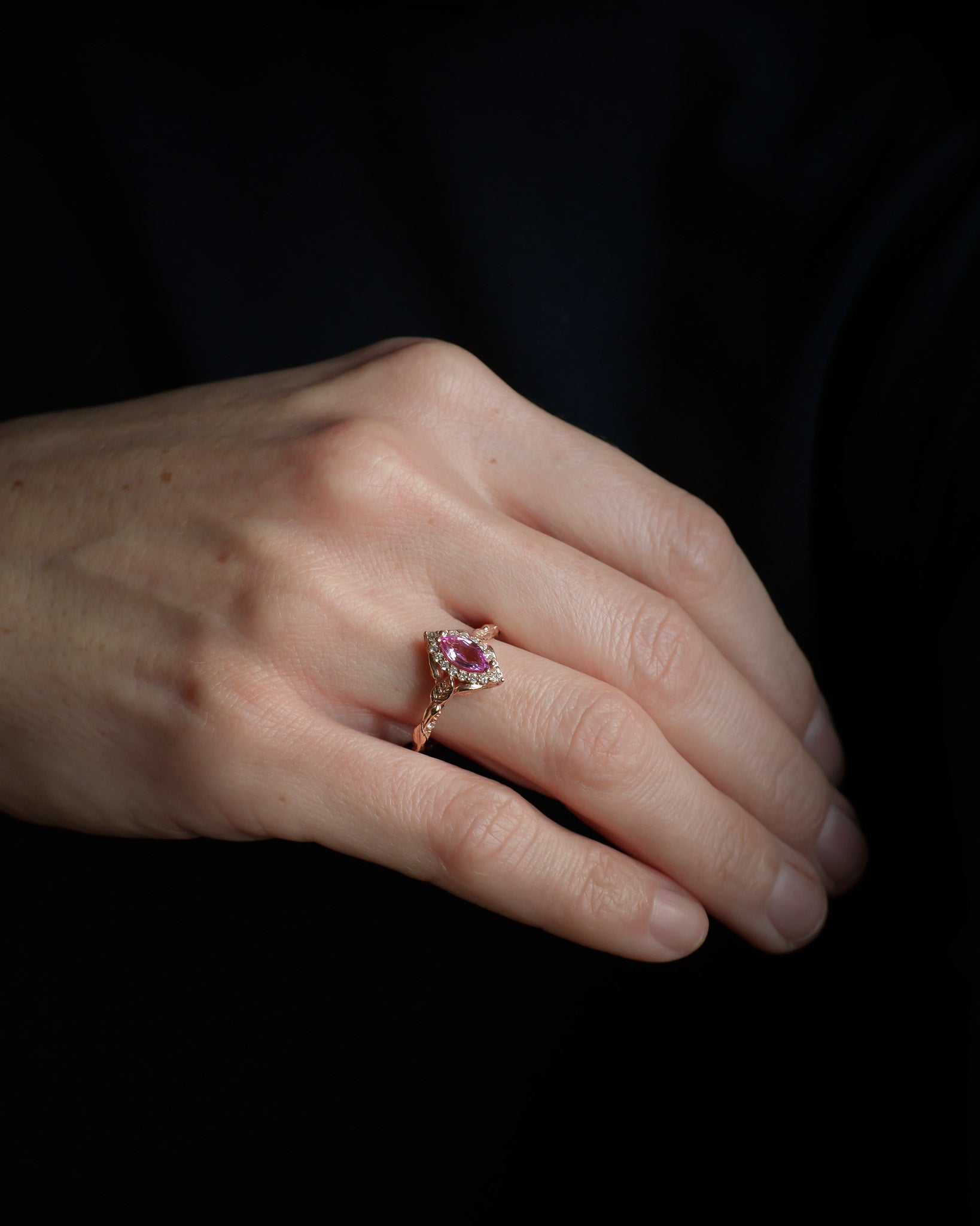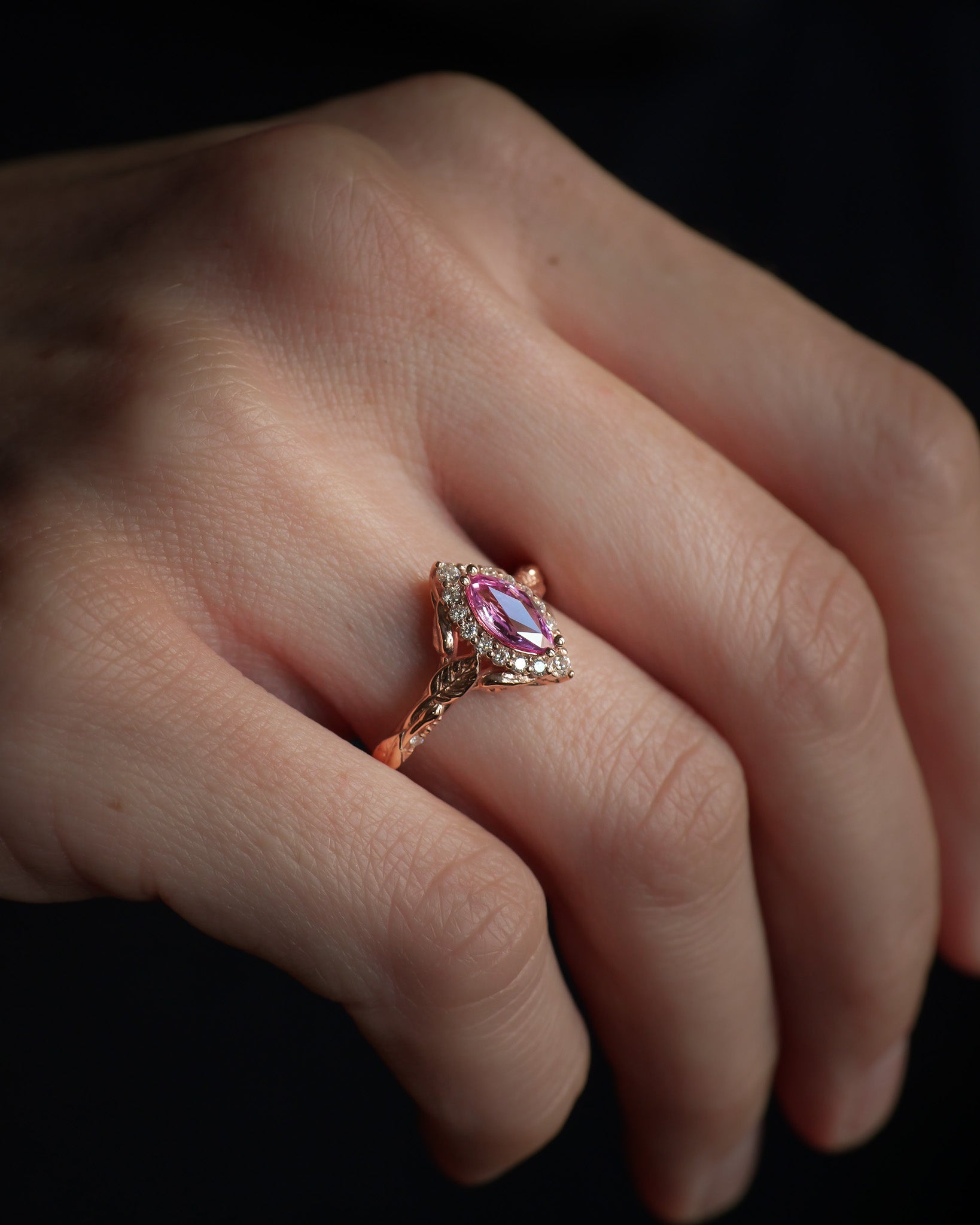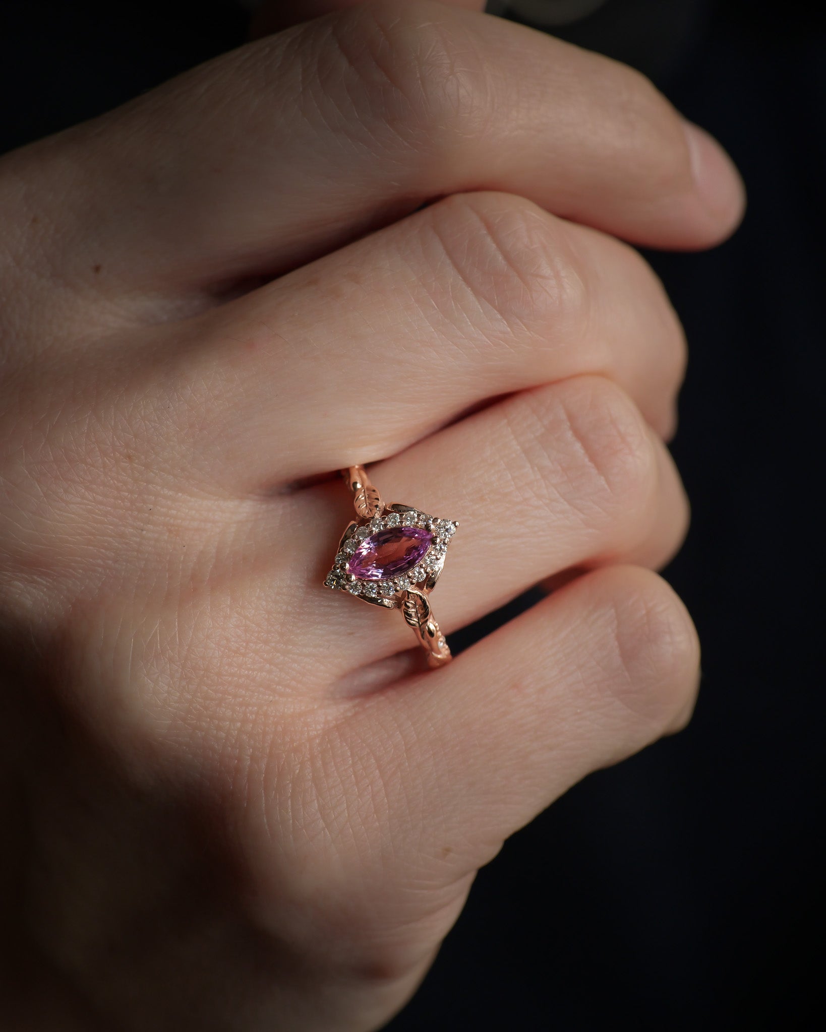 Pink sapphire engagement ring, gold leaf ring with marquise cut gemstone and diamond halo / Florentina