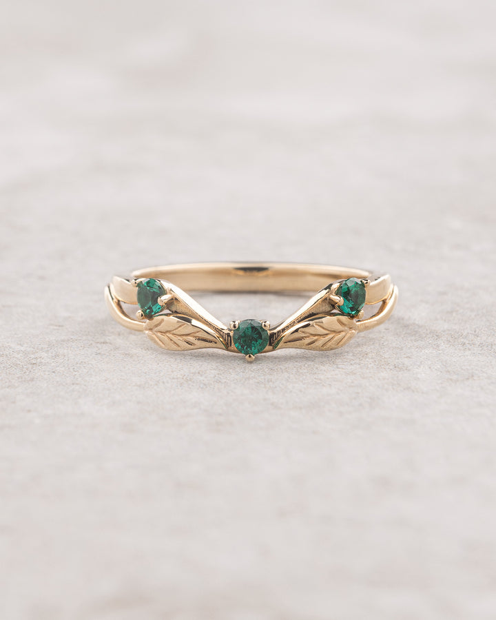 This nature wedding band features delicate design with three lab created emeralds. It is a dainty jewelry piece but sturdy enough for everyday wear. Recycled gold and lab grown gemstones are a sustainable choice and has perfect appearance.