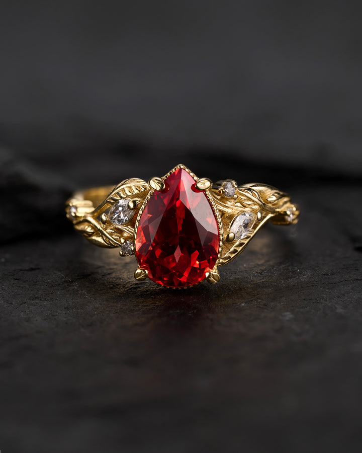 Patricia ring shows intricate design with vines and leaves interlacing naturally. Side gemstones are scattered between twigs - marquise cut gemstones remind us of leaf shapes, and small round cuts look like shiny morning dew. The central gemstone has a beaded frame around which adds extra detailing.