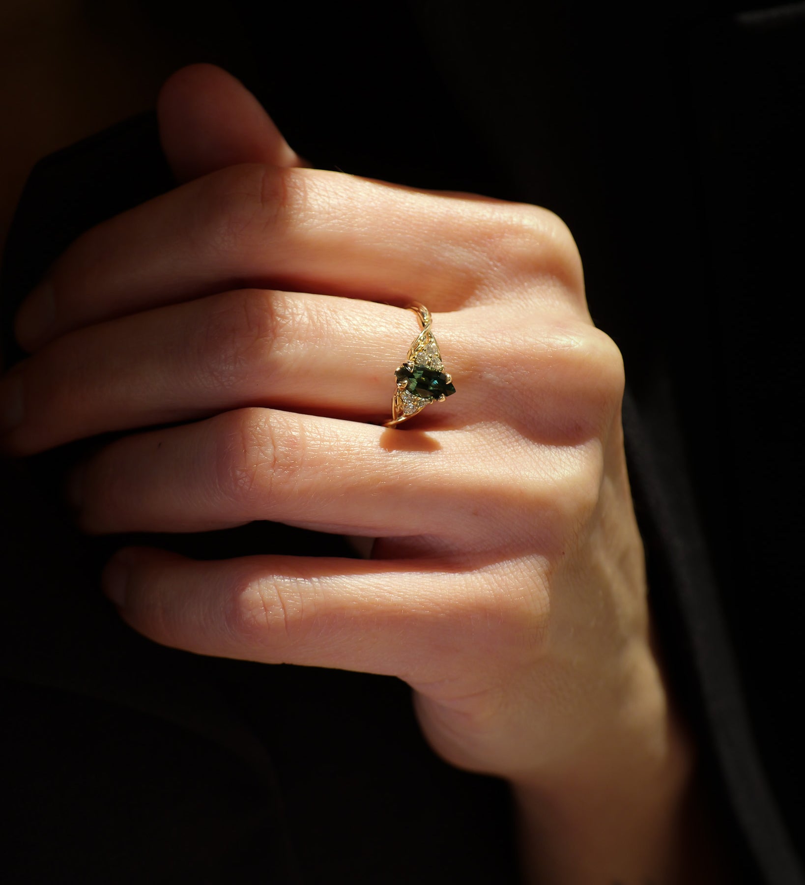 Sometimes, after the rain, you may notice precious droplets lingering on the tips of the leaves in our garden. In times like this, we collect these drops to merge the sky, water, and air into the shape of a teal gemstone ring, ready to sit delicately on your finger, emphasizing your natural beauty.