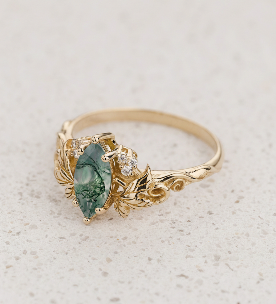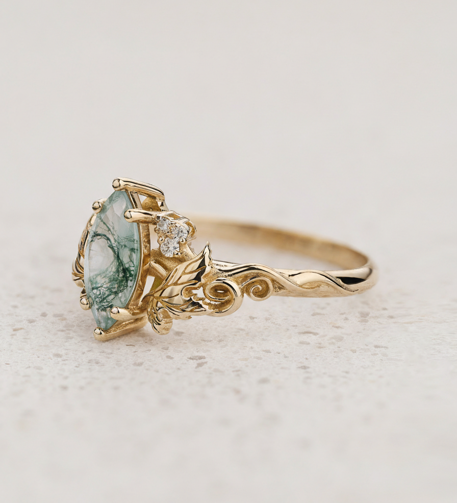 Round moss agate engagement ring with accent sapphires, nature themed proposal ring with diamonds