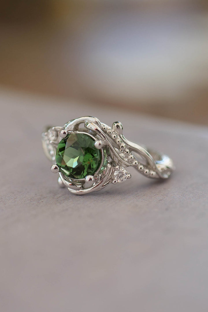 Hypnotising flow of art nouveau style is a feature of this green tourmaline ring with diamonds. Wavy lines are adorned with enlarged milgrain reminiscent water bubbles swirling around the focal gemstone. Flowing stamens and small leaves complete the whole composition.