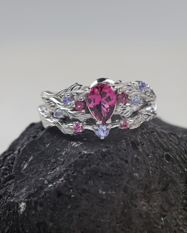 Delicately sculpted, this bridal set would be perfect for alternative engagement ring seekers. You can see Japanese maple leaves wrapping the central gemstone - natural pink tourmaline. Adorned with accent pink tourmalines & blue tanzanites.