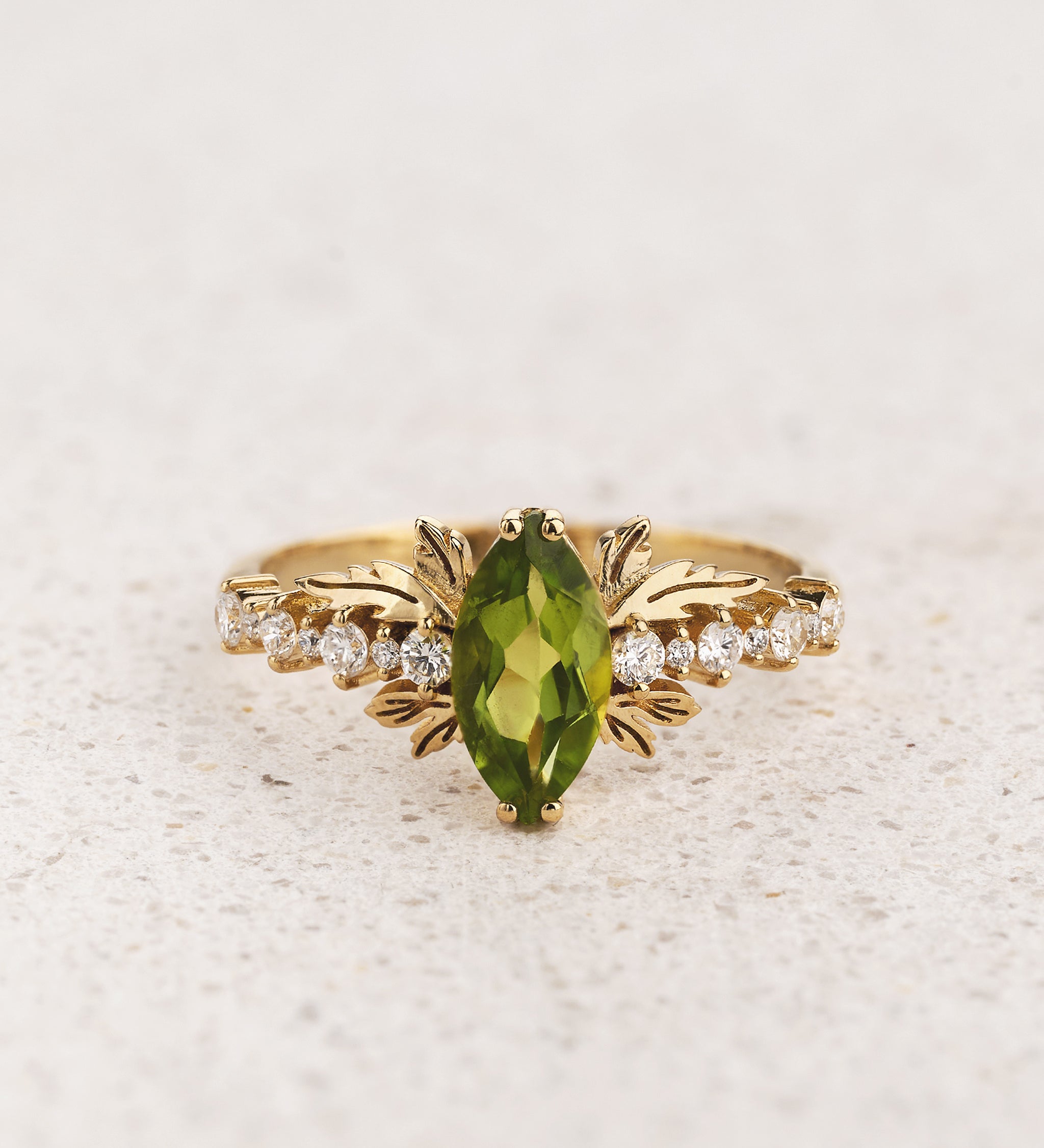 Timeless elegance with a botanical twist. Verbena’s focal gemstone rests on a wreath of intricate gold leaves that give it a sculptural quality, but the ring is smooth enough for everyday wear. The accent diamonds on the band alternate in size like water droplets, adding sparkle and brilliance. Our Verbena setting is shown with a marquise cut stone, but it can be adapted for other cuts. Choose natural or lab grown diamonds for the band.