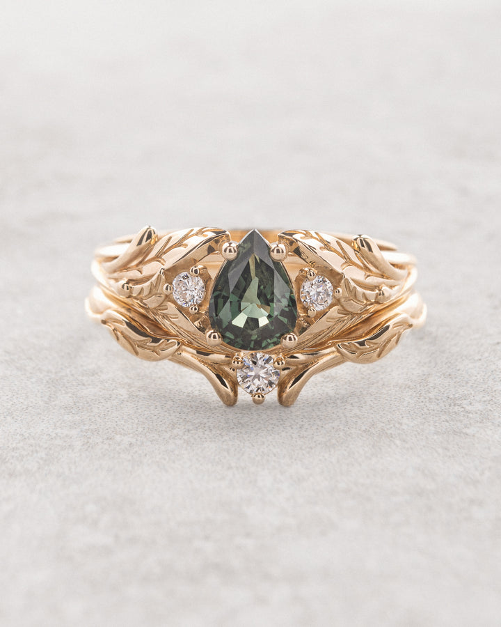 Green sapphire and diamonds bridal ring set / Wisteria