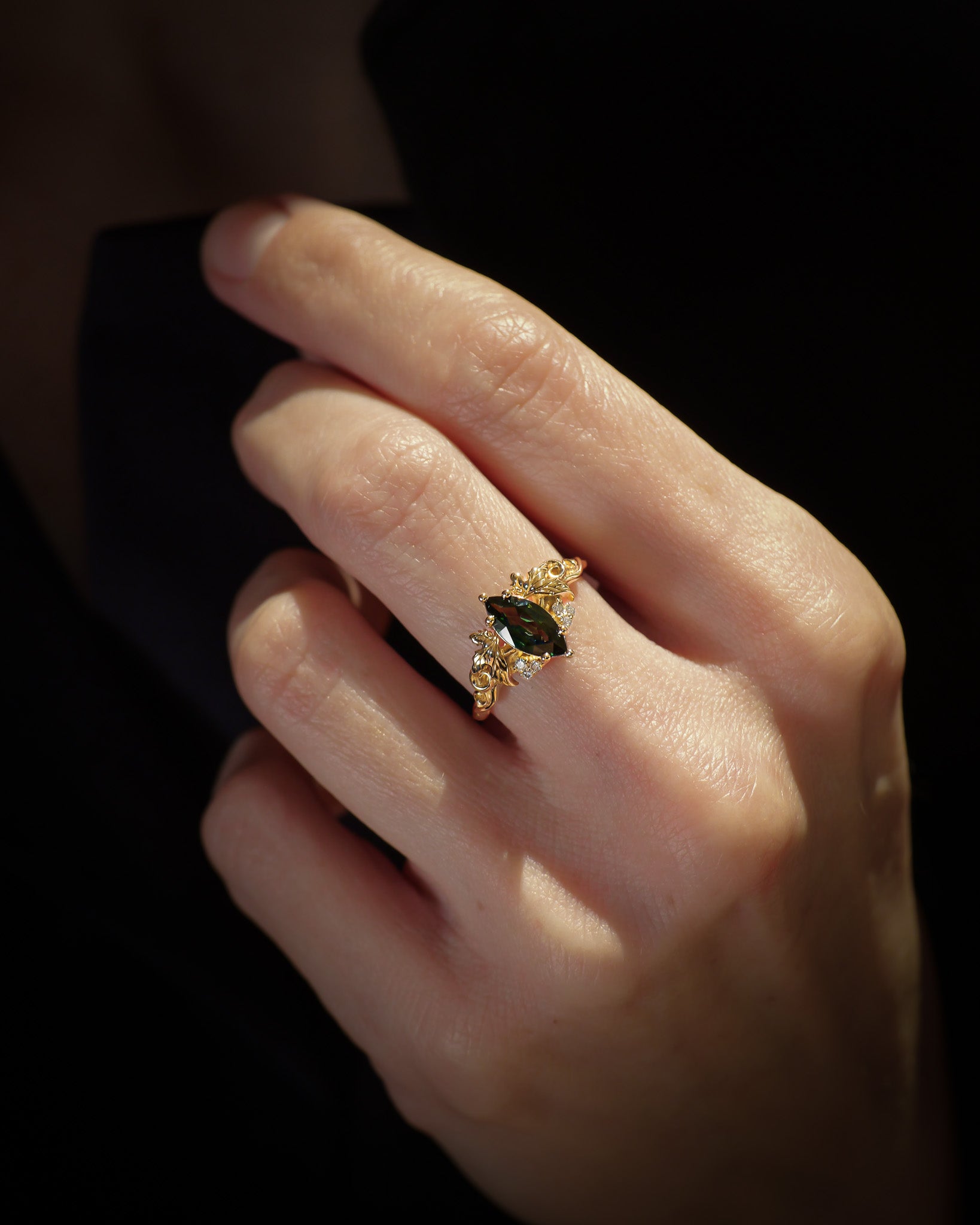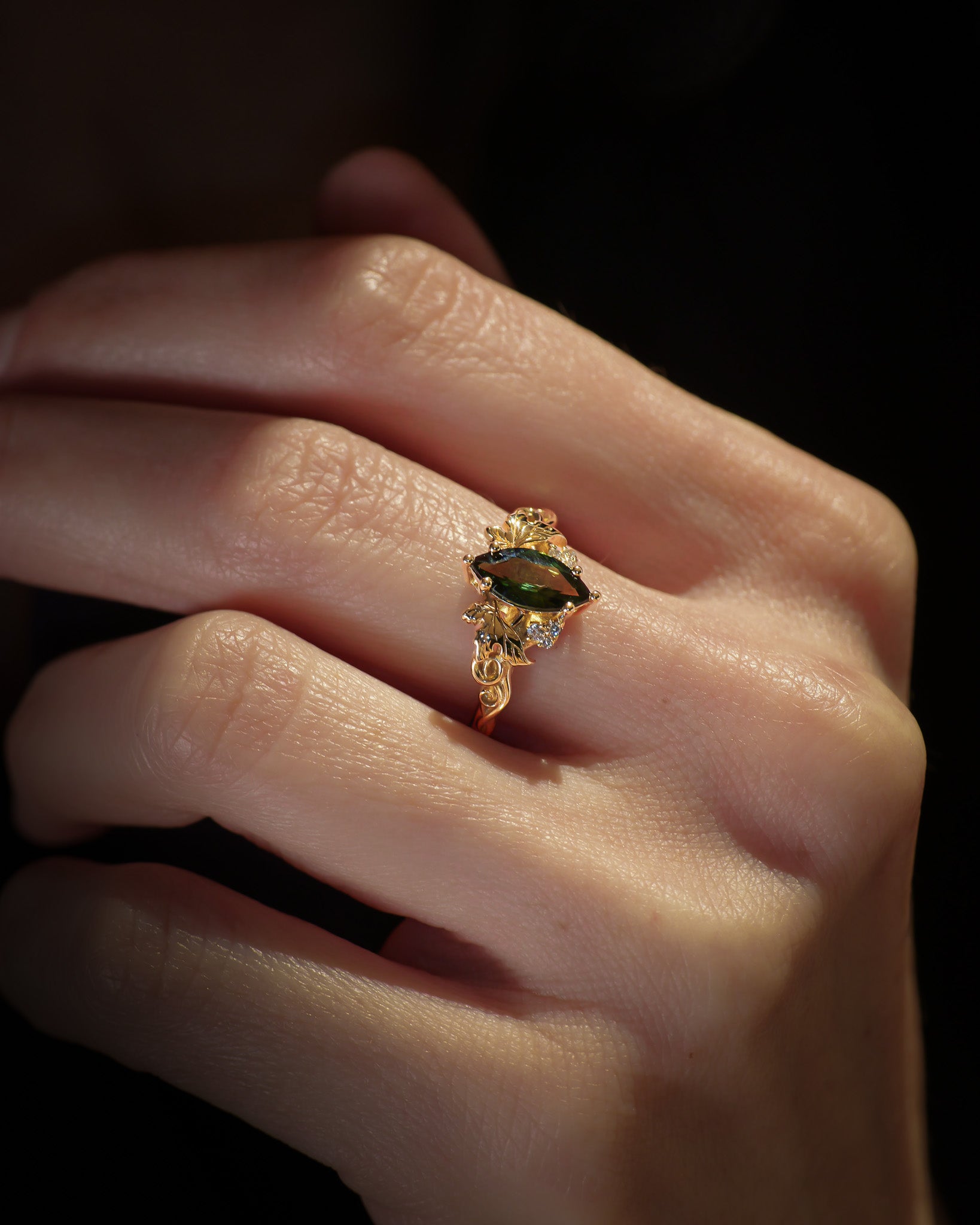 READY TO SHIP Vineyard ring with marquise-cut natural green sapphire, 14K yellow gold, AVAILABLE RING SIZES: 5.5 - 8.5 US