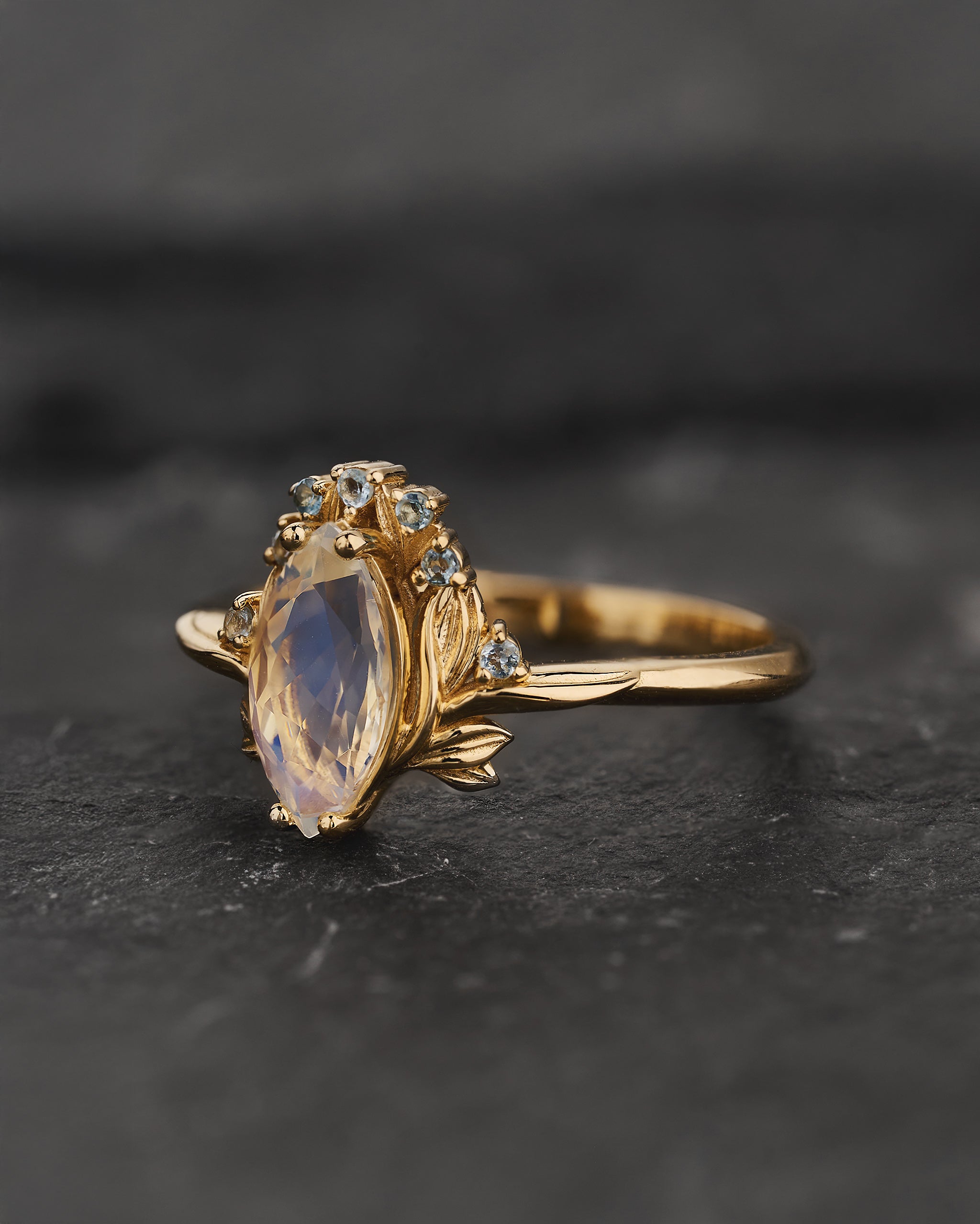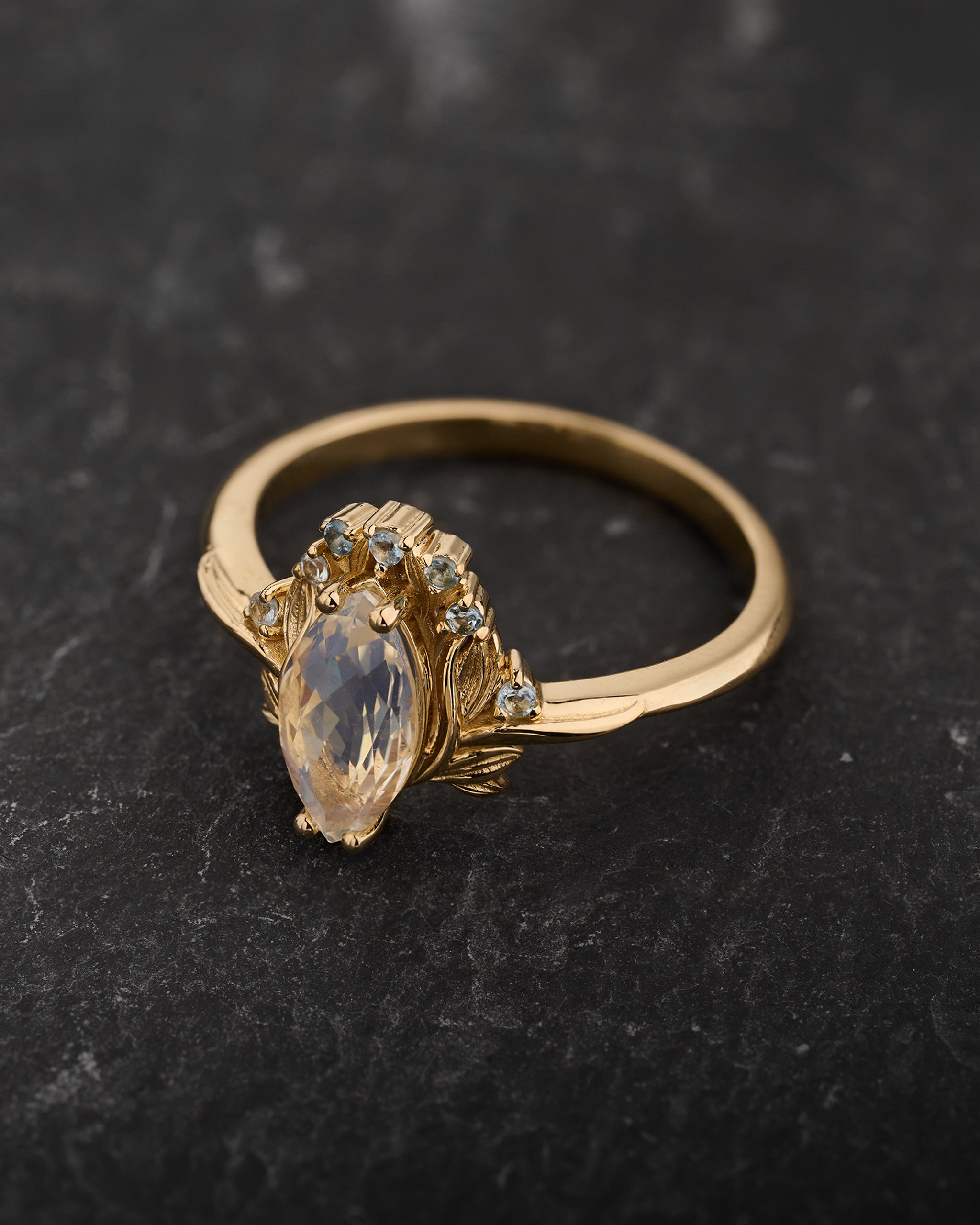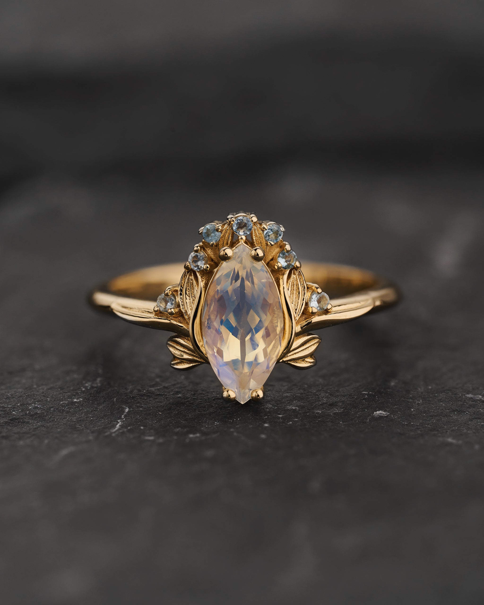 Flower-inspired Engagement Ring with Moonstone and Accent Aquamarines / Iris