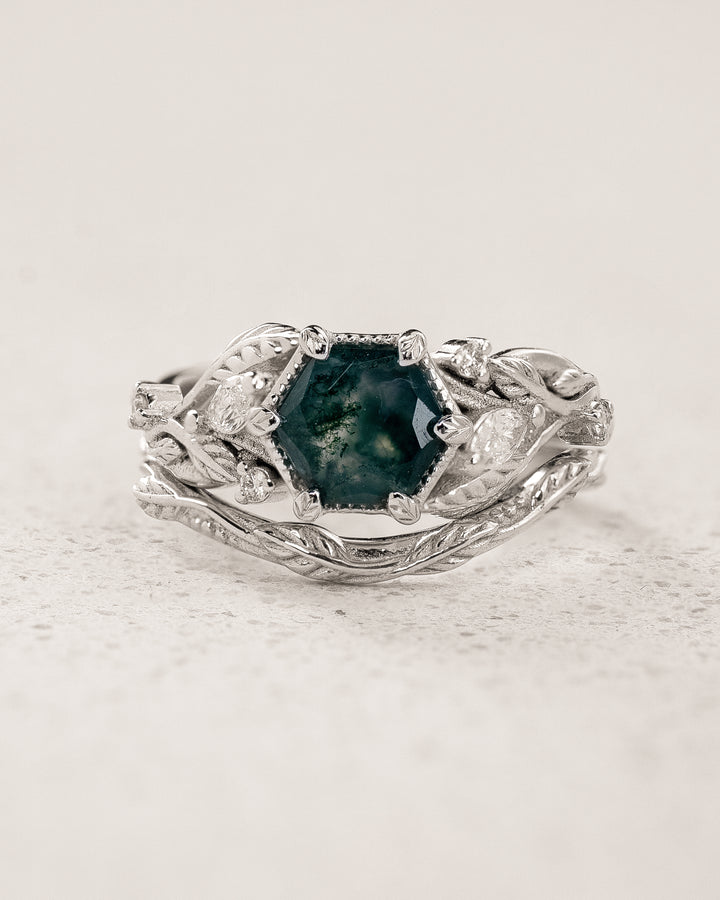READY TO SHIP: Patricia ring set with moss agate, 14K white gold, AVAILABLE RING SIZES: 3.5 - 6.5 US