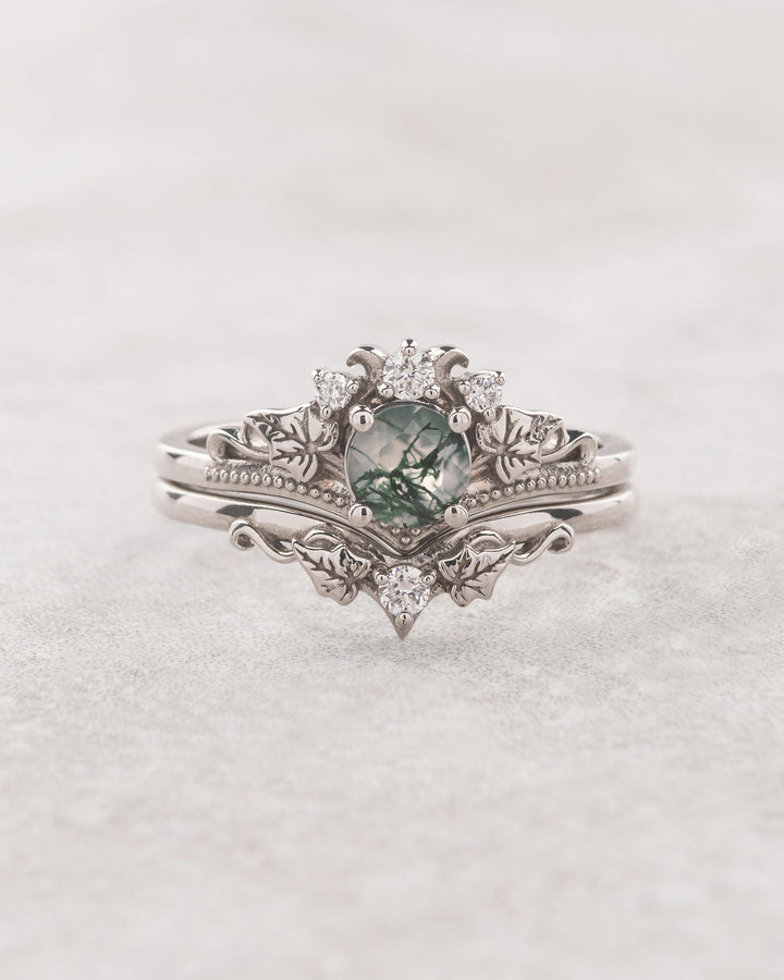 Magnificent wedding ring set features nature inspired style with tiny ivy leaves and the most delicate details you can imagine. This version comes with round cut gemstone - natural moss agate. It will be a great choice for those looking for untraditional yet elegant and timeless engagement ring.