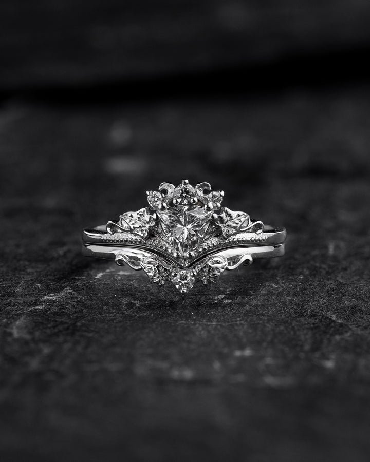Ariadne engagement ring features nature-inspired style with tiny ivy leaves and the most delicate swirls you can imagine. Tiara-shaped engagement ring will make her breathless with its sophisticated and timeless design.