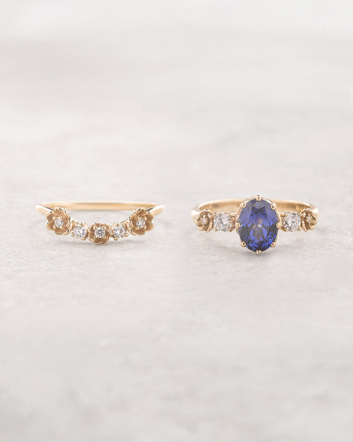 Bridal ring set with royal blue sapphire and delicate flowers / Fiorella