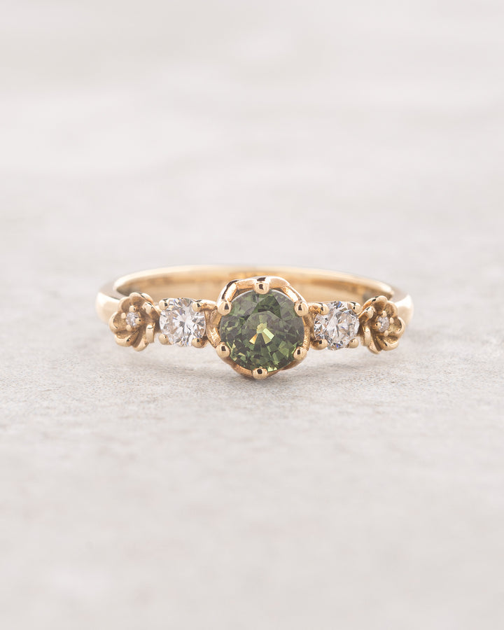 Delicate floral engagement ring with green sapphire and diamonds / Fiorella
