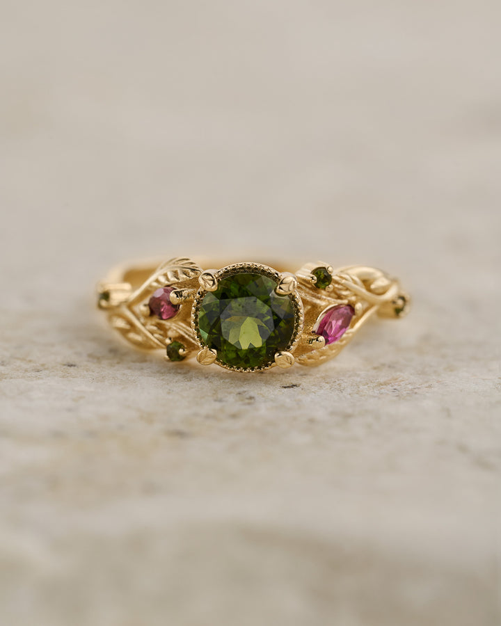 READY TO SHIP: Patricia ring in 14K yellow gold, green tourmaline, round cut 6mm, accent tourmalines, AVAILABLE RING SIZES: 5.5 - 8.5 US - Eden Garden Jewelry™