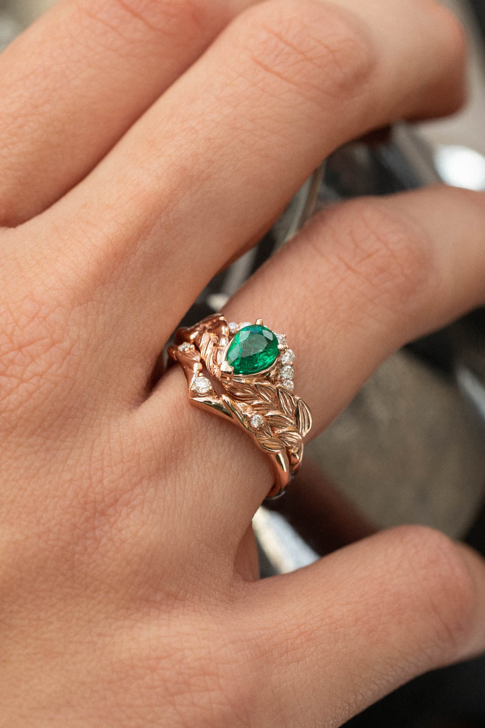 Natural emerald bridal ring set, diamond crown gold leaf engagement and wedding rings  / Palmira Crown - Eden Garden Jewelry™