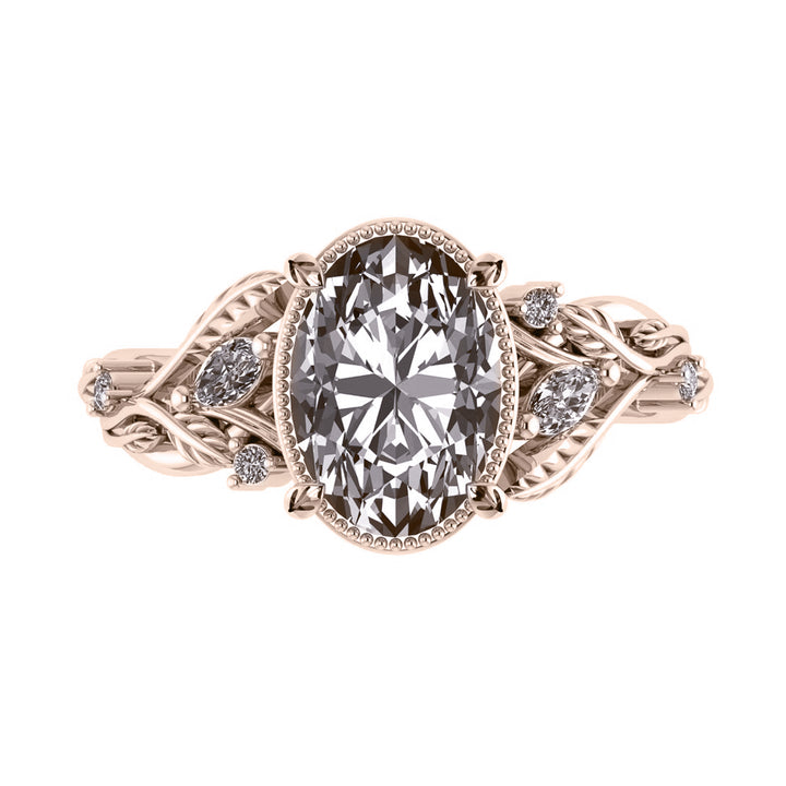 The asymmetrical Patricia ring shows an intricate design of vines and leaves that weave together in a natural way. Side gemstones are scattered between the twigs - marquise cut gemstones resemble leaf shapes and small round cuts look like shiny morning dew. The central gemstone has a beaded frame around it, adding extra detail.