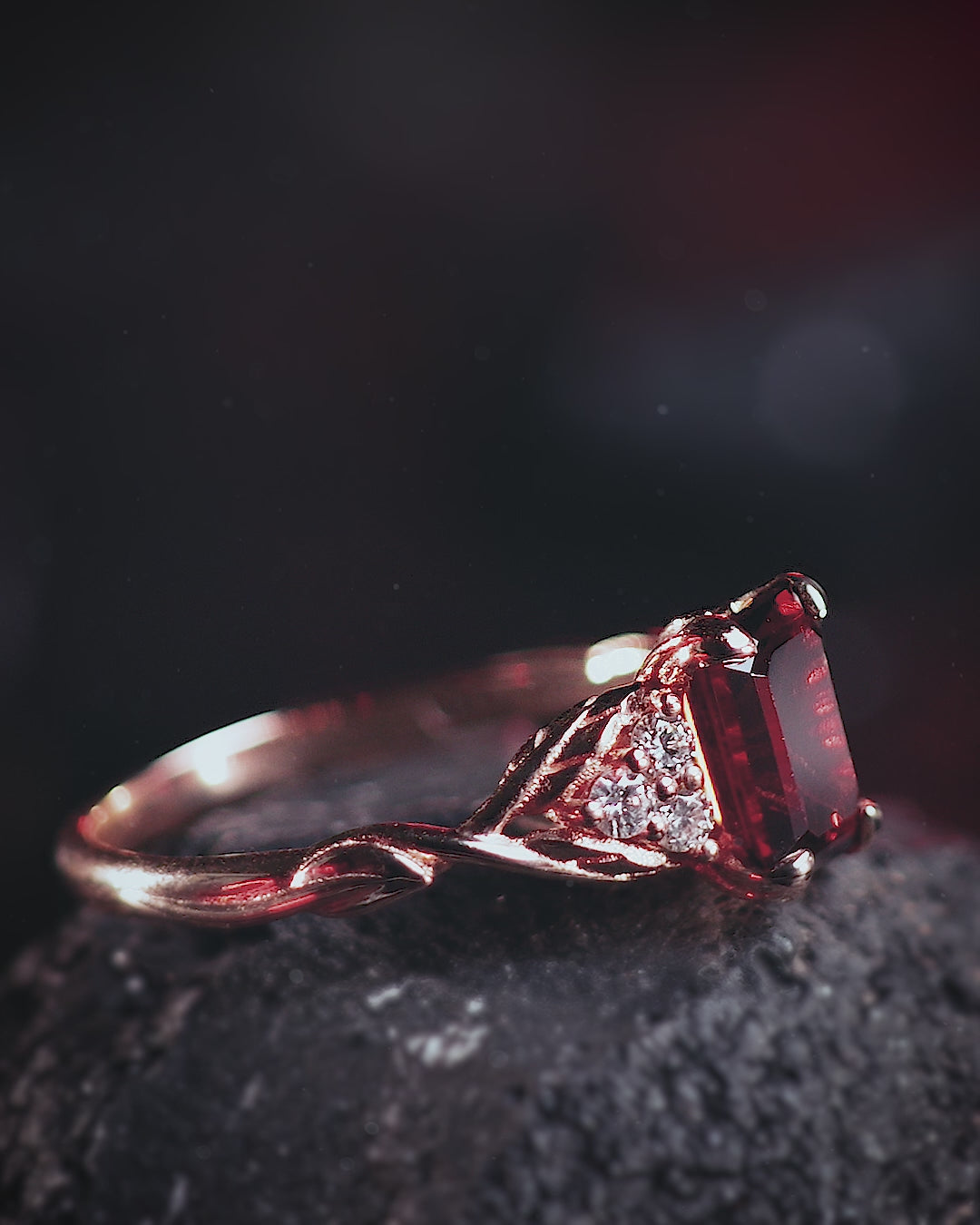 Natural garnet and diamonds engagement ring, emerald cut gemstone rose gold ring / Gloria - Eden Garden Jewelry™