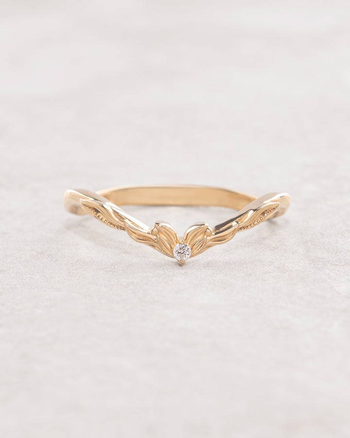 This diamond wedding band is designed to match with our Adonis engagement ring, but can be used separately as well. It features nature inspired style with small leaves, tiny details and curved shank.