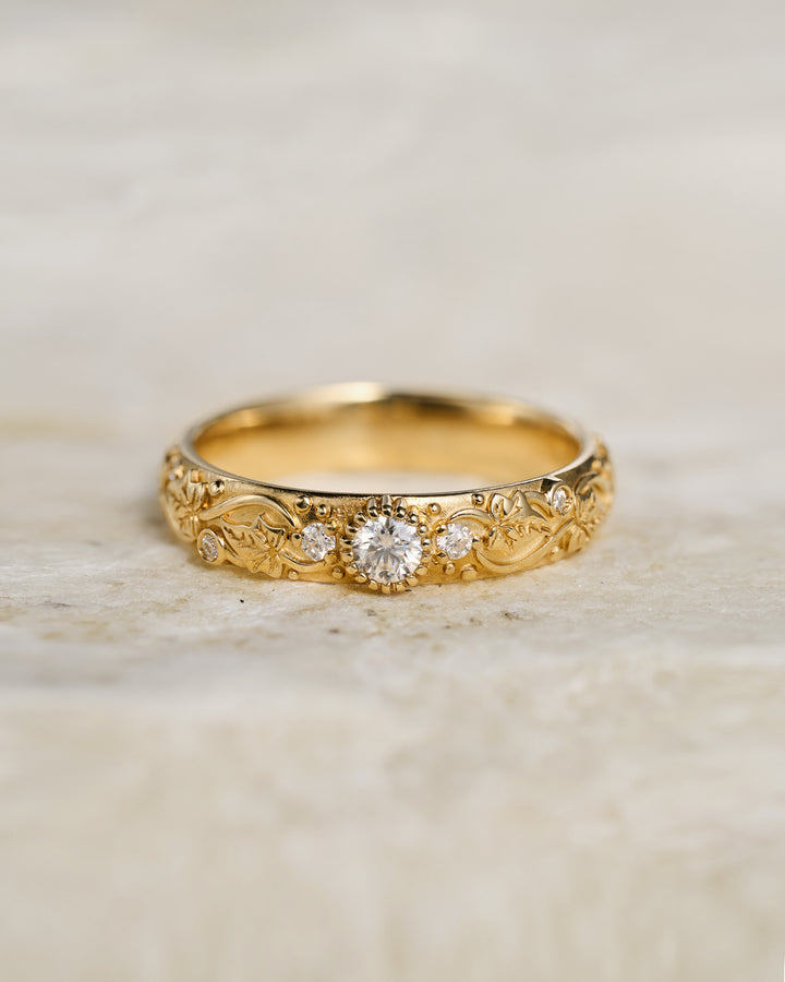 The lovely wreath wedding band features a detailed design with ivy leaves and moissanites. Wedding band for woman has 4 mm width and is comfortable to stack with other straight bands. The classical yet original design is meant to be cherished by generations.