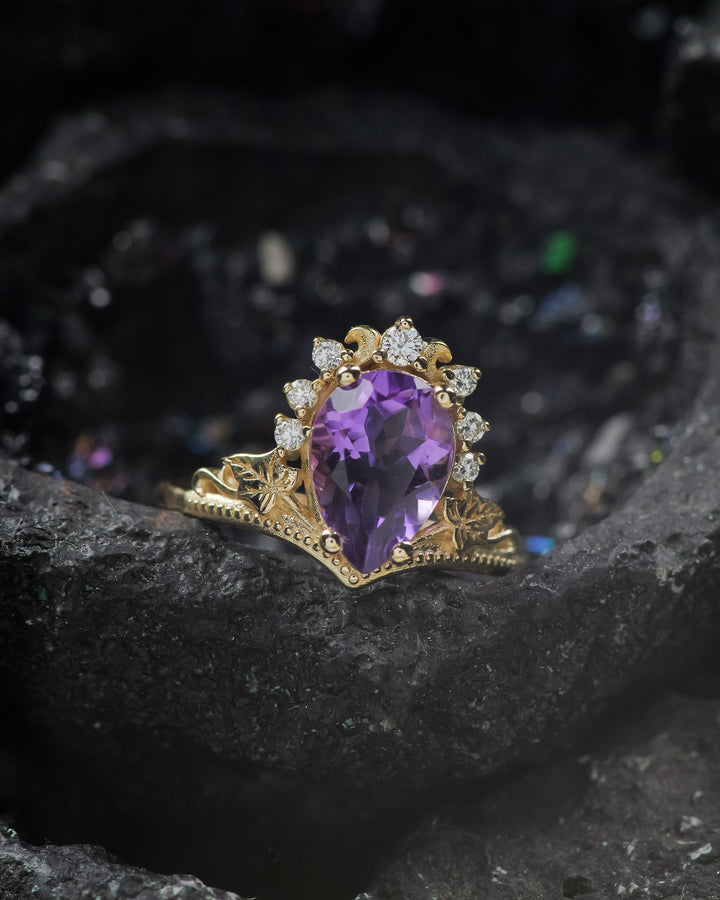 Magnificent engagement ring features nature inspired style with tiny ivy leaves and the most delicate details you can imagine. This version comes with a big pear-cut gemstone - natural amethyst. It will be a great choice for those looking for an untraditional yet elegant and timeless engagement ring.