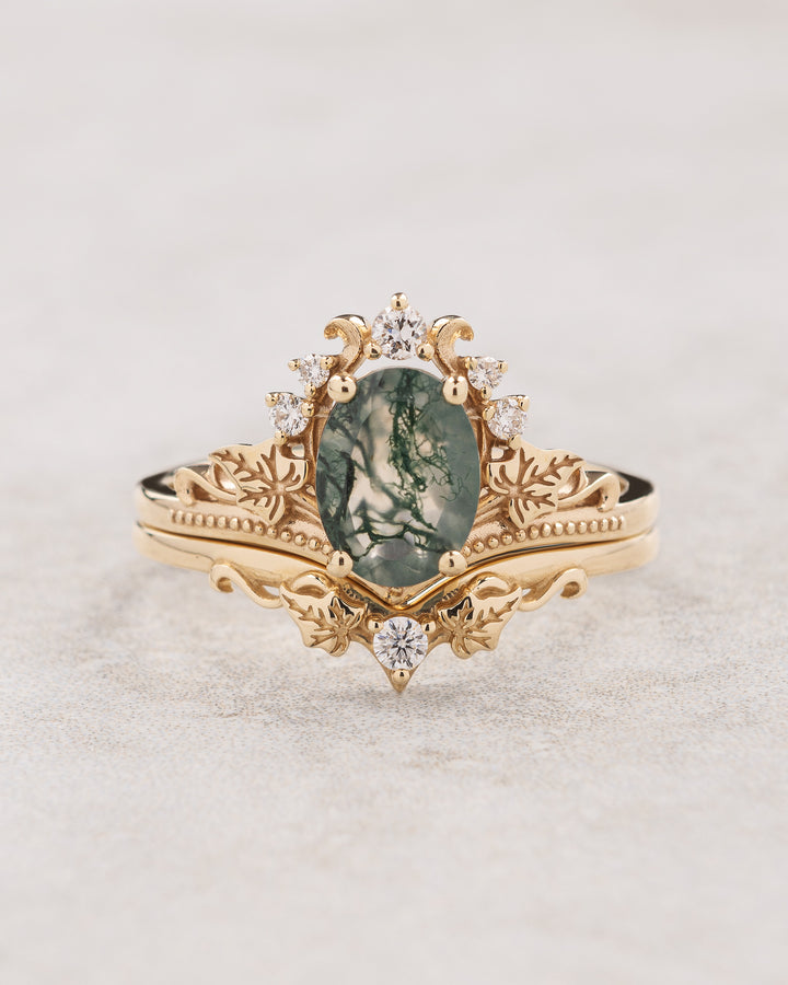 Oval moss agate engagement ring with ivy leaves and a matching wedding band / Ariadne