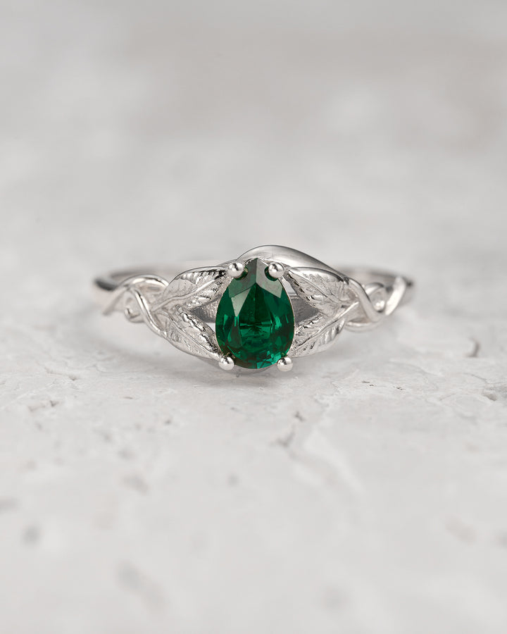 Pear cut gemstone variation of our popular Azalea style ring. Sculpted from recycled solid gold and adorned with lab emerald this engagement ring shows perfect appearance and offers sustainable choice.