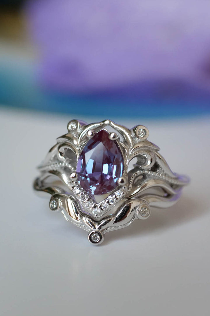 Exceptionally delicate, this bridal set is inspired by art nouveau style. Pear cut gemstone is surrounded by stylised flowers and adorned with sparkling diamonds. Color changing lab alexandrite is truly magical - it changes colours depending on a lighting.