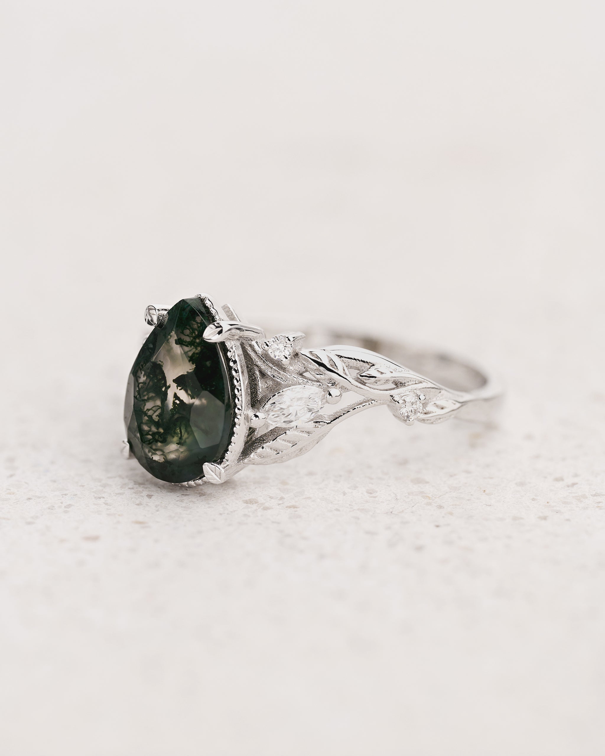 Patricia ring shows intricate design with vines and leaves interlacing in a natural way. Side gemstones are scattered between twigs - marquise cut gemstones are reminding leaf shapes and small round cuts look like shiny morning dew. Central gemstone has a beaded frame around which adds an extra detailing.