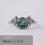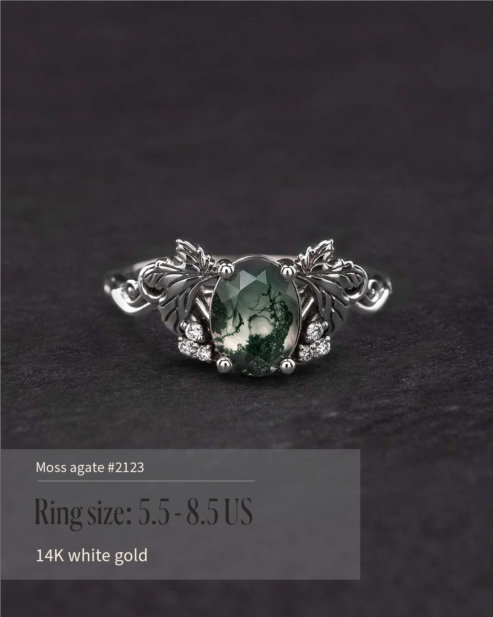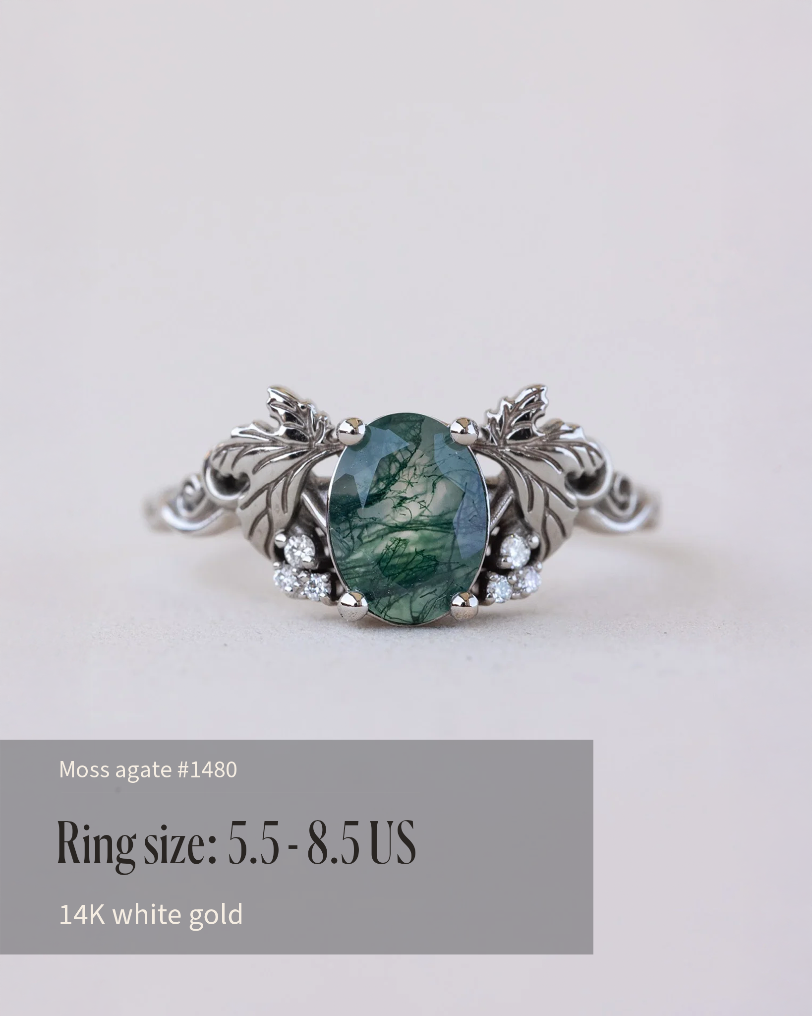 READY TO SHIP Vineyard engagement ring in 14K white gold, moss agate 8x6mm, accent lab grown diamonds, AVAILABLE RING SIZE: 5.5 - 8.5 US