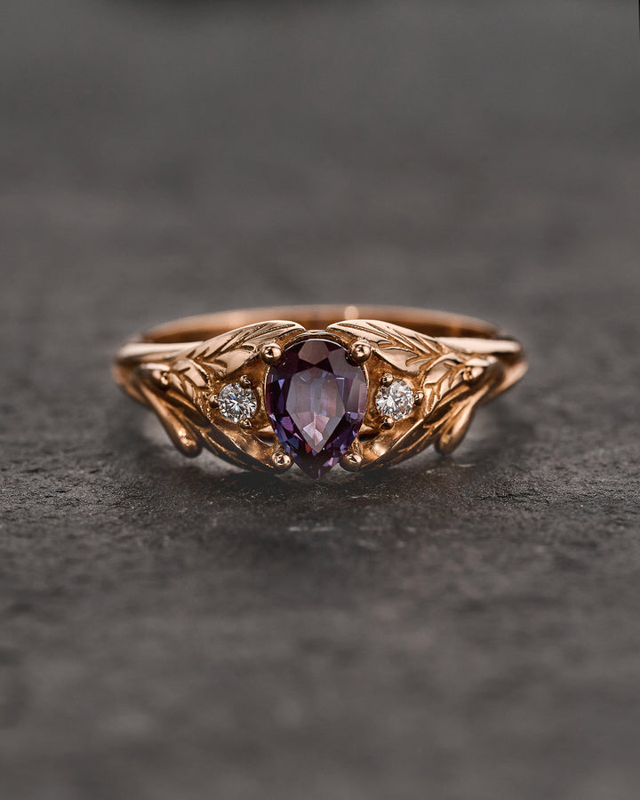 Pear alexandrite ring with diamonds, leaf engagement ring / Wisteria - Eden Garden Jewelry™