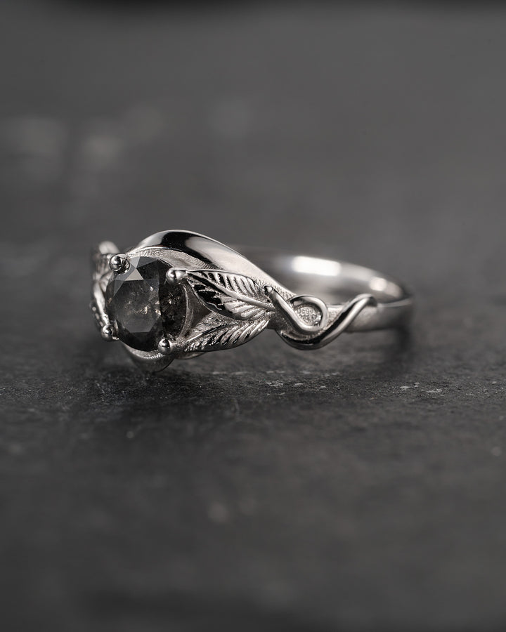 It's all about harmony and romance. Azalea ring will represent your tender feelings and serious intentions in the best way. Handcrafted from solid gold this engagement ring features detailed leaves and organic lines wrapped around the central gemstone.