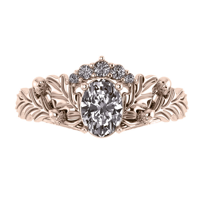 We love oak leaf shapes and have made this ring set as the best dressed ring from our oak collection. The central oval-cut gemstone has a gemstone crown that really makes it look like a royal piece. Highly detailed oak leaves are arranged around the central gemstone and tiny acorns will amaze her with cuteness and high quality work.