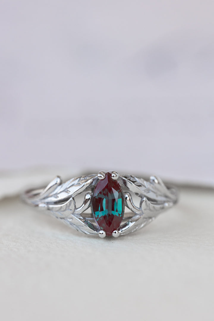 Colour changing alexandrite engagement ring, white gold twig ring with marquise alexandrite