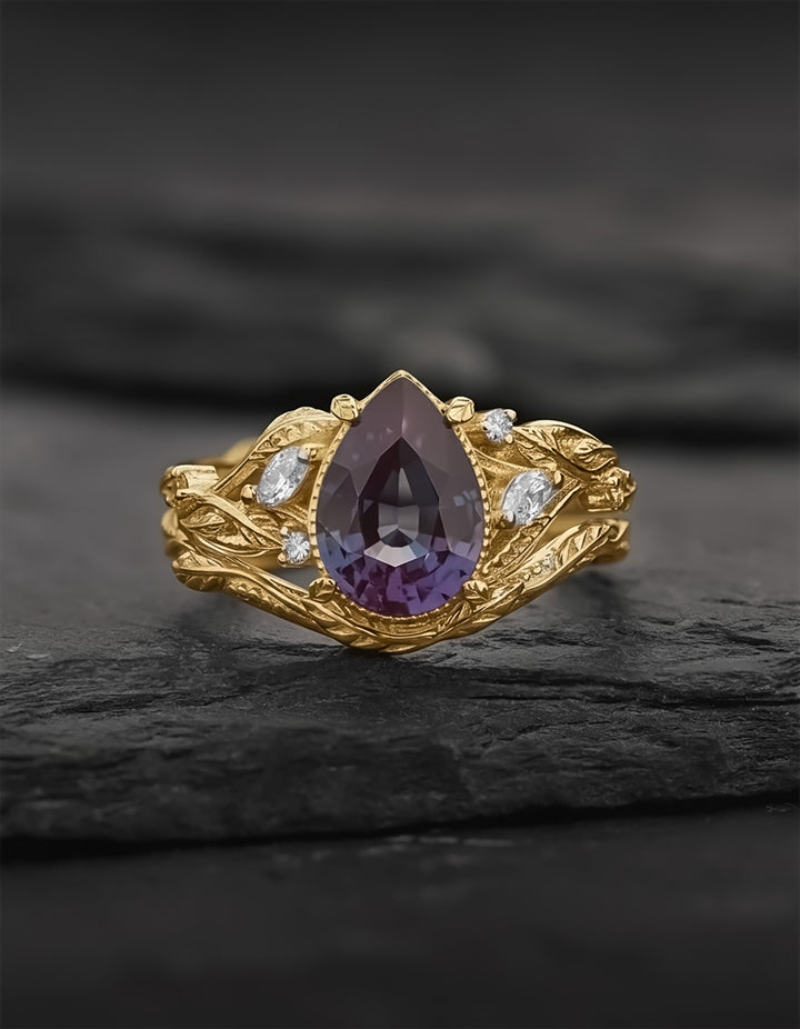 Pear alexandrite leaf bridal ring set, engagement ring set with colour changing gemstone