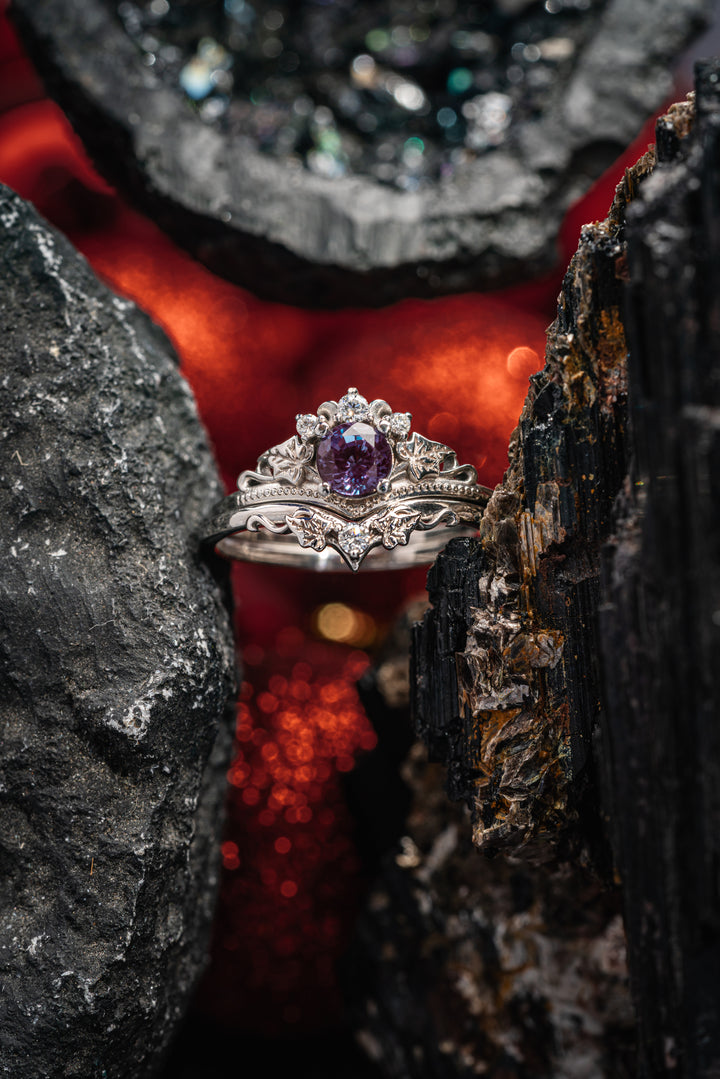 Magnificent wedding ring set features nature inspired style with tiny ivy leaves and the most delicate details you can imagine. Round cut lab alexandrite has great colour changing properties. Small accent natural diamonds compliments this romantic jewelry piece.