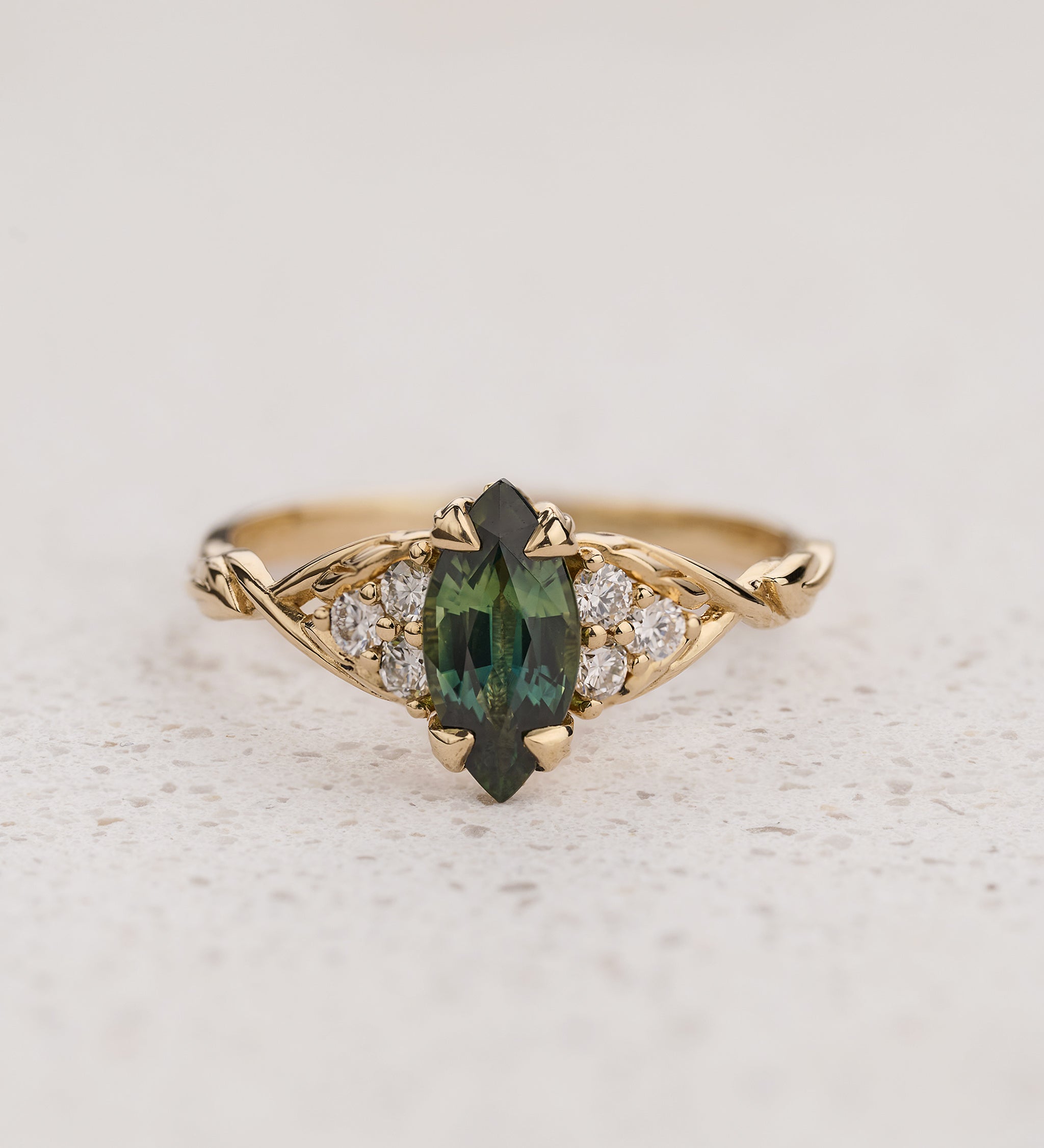 READY TO SHIP: Gloria ring with marquise-cut natural teal sapphire, 14K yellow gold, AVAILABLE RING SIZES: 5.5 - 8.5 US