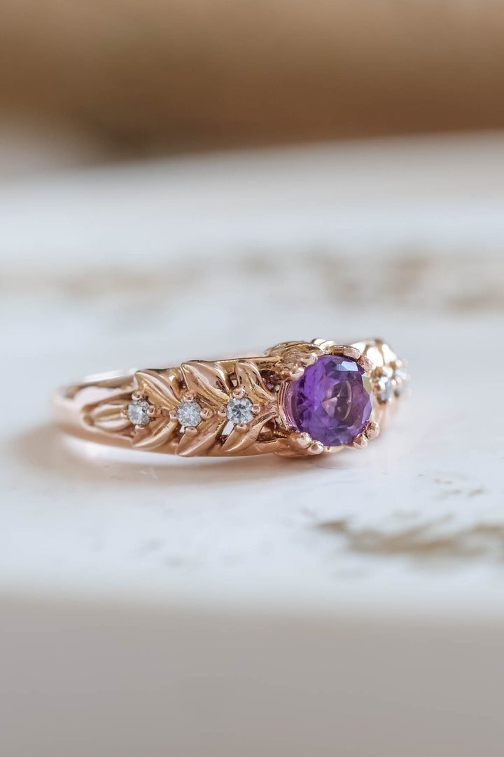 This unique engagement ring is made from solid gold and adorned with amethyst as a central gemstone and manmade diamonds as accents. Nature ring features botanical design with detailed leaves and romantic mood with touch of vintage inspired style.