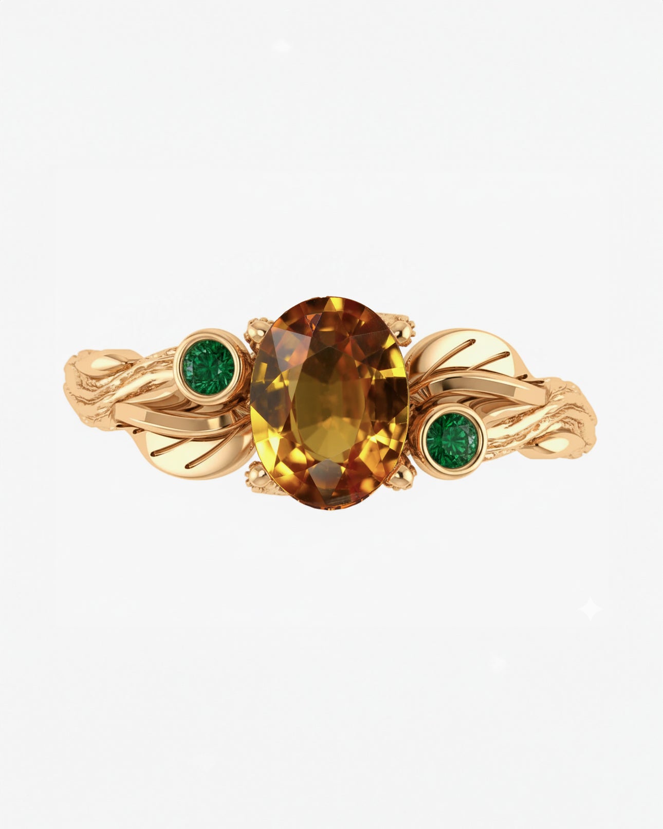 Custom order: Arius ring with 1.5 ct orange sapphire and emeralds, 14K yellow gold