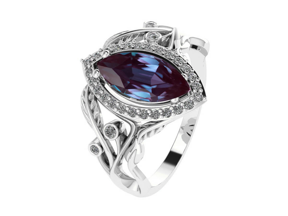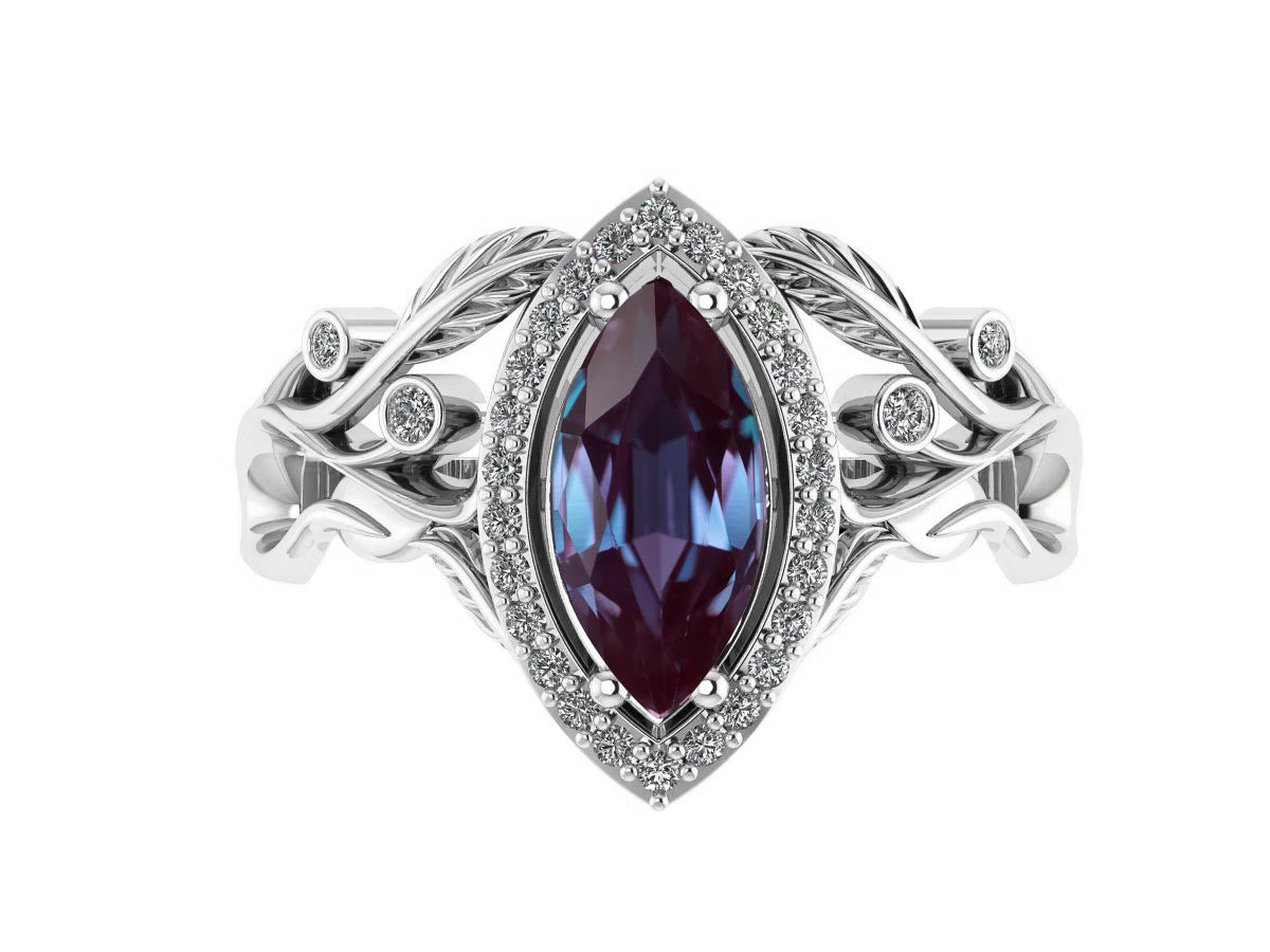 Central gemstone: lab-grown alexandrite, marquise-cut, 10x5mm, 1.2ct