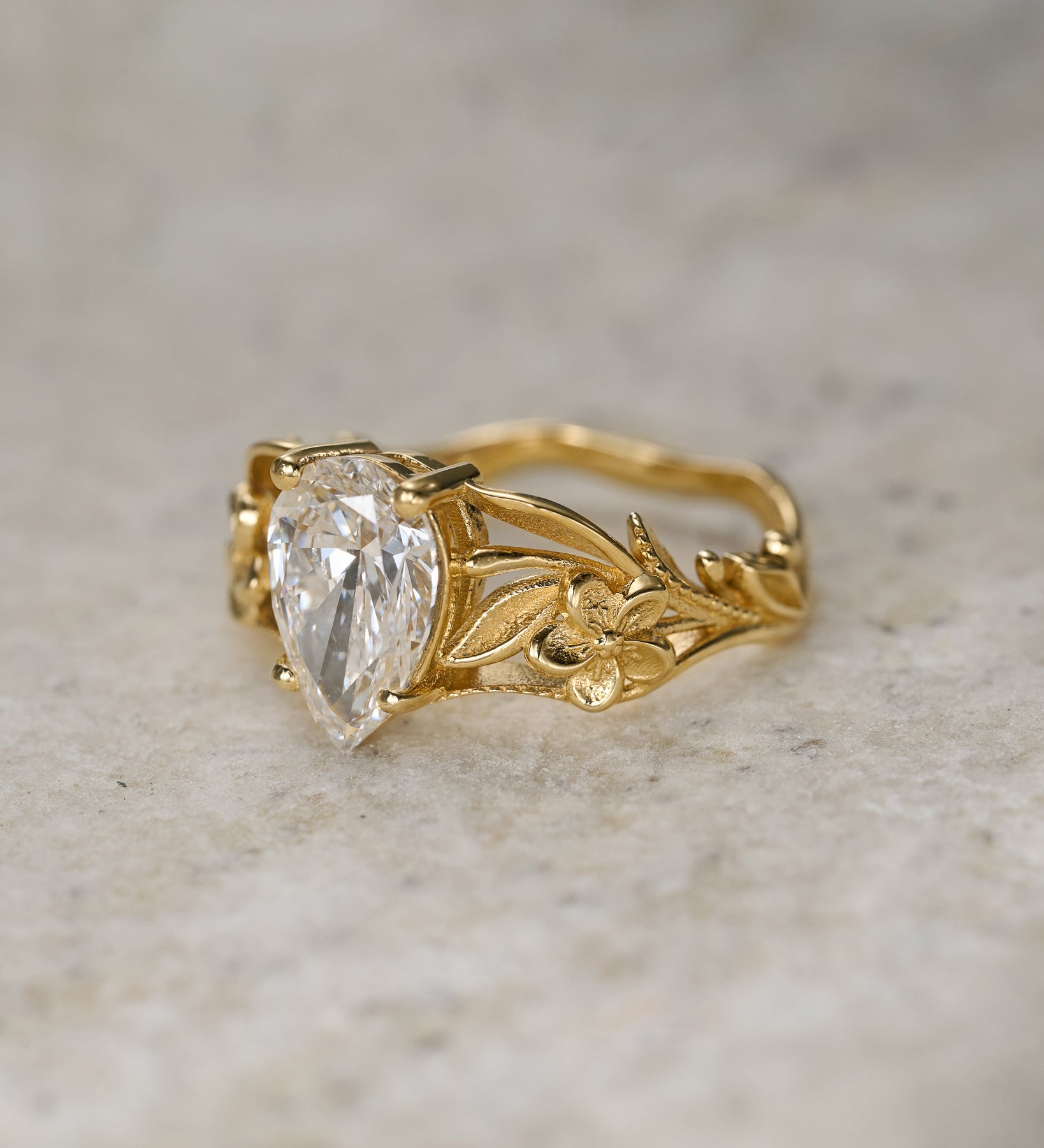 The art nouveau inspired Eloise features flowing lines of flowers and leaves. This setting takes a pear cut gemstone and can be customized. The matching wedding band adds depth to the set, with a pair of vines holding the accent stone of your choice.